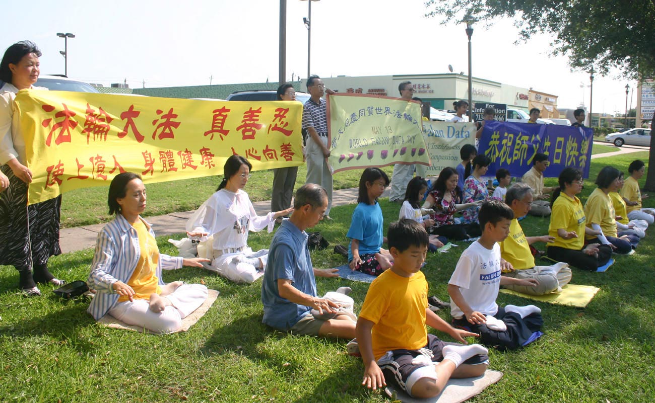 二零一二年五月五日,休士顿天气晴朗,阳光灿烂,上午九点至十二点,休士顿法轮功学员在中国城百利大道(Bellaire Blvd)公共草坪举行庆祝活动。一些学员手持中文、英文、越文横幅“法轮大法,真善忍”,“上亿人修炼,身体健康,人心向善”。“普天同庆同贺世界法轮大法日”。一些学员炼功打坐,场面祥和宁静,明慧学校大法小弟子也参与了当天庆祝活动。