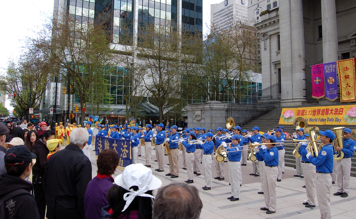 ![]() 温哥华法轮功学员集会庆祝大法弘传二十周年,天国乐团在演奏 |