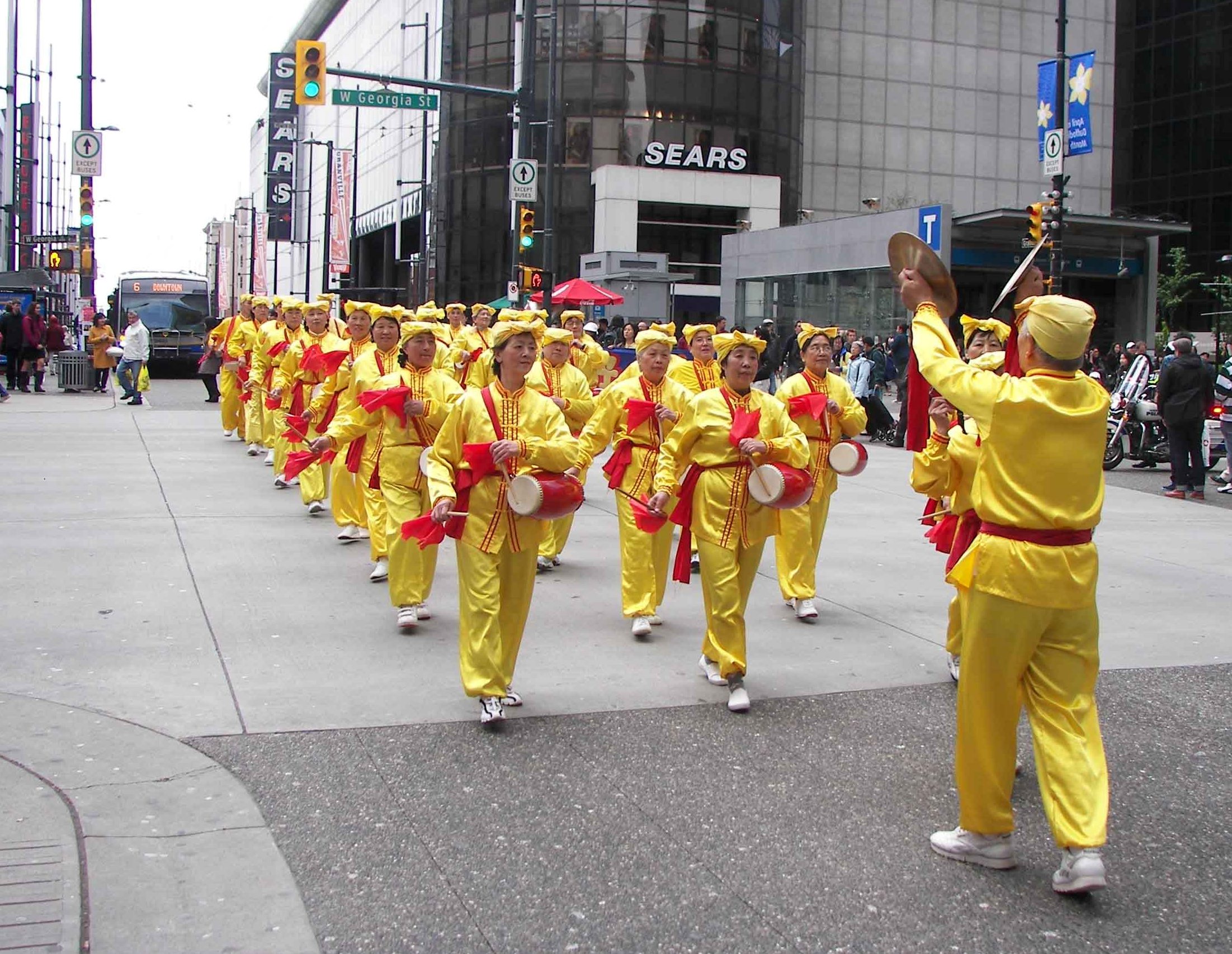 温哥华市中心艺术馆前的庆祝活动中,以老年法轮功学员为主的腰鼓队表演,让众多观看表演的路人惊叹。