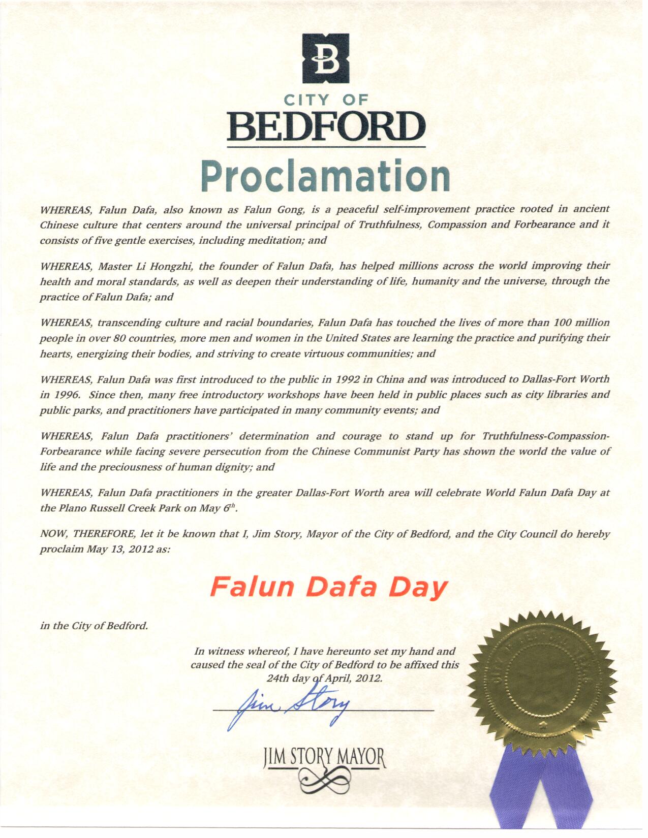 因此,我,吉姆•斯陶瑞,伯德福特市市长及市议会,宣布二零一二年五月十三日为“法轮大法日”。