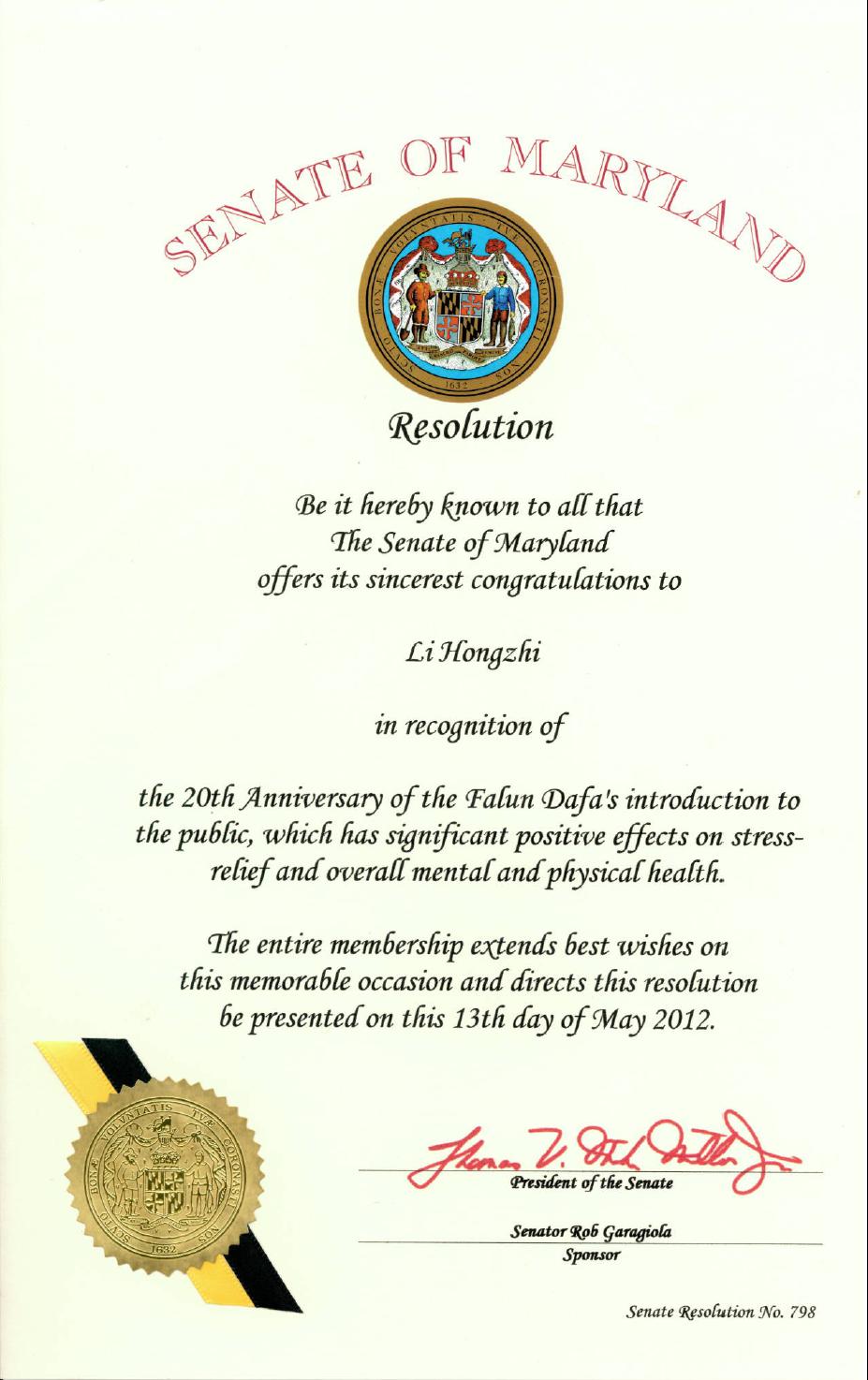 【明慧网二零一二年五月七日】美国马里兰州参议院通过了第七九八号决议案,表彰法轮大法对减轻压力和促进身心健康的积极正面效果。