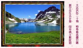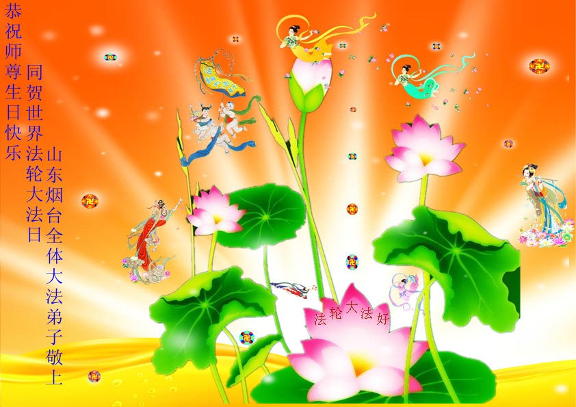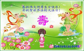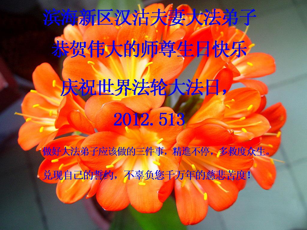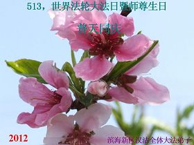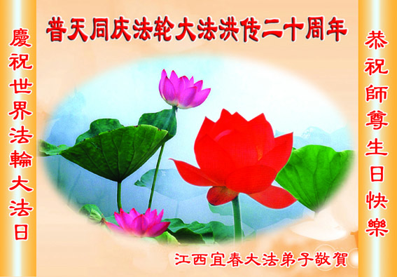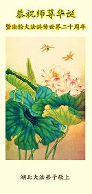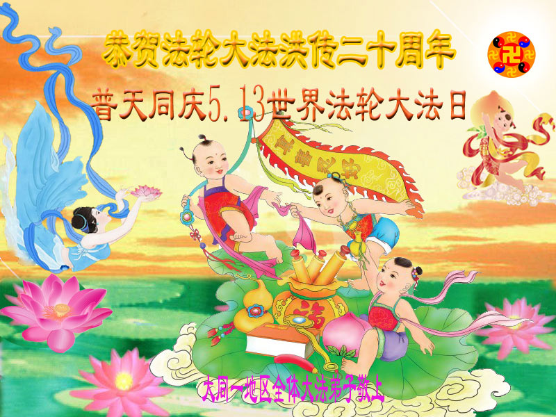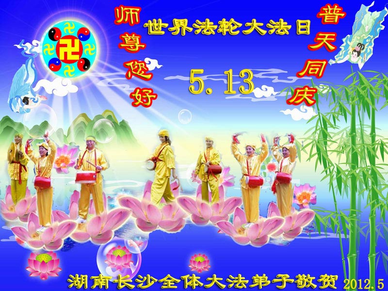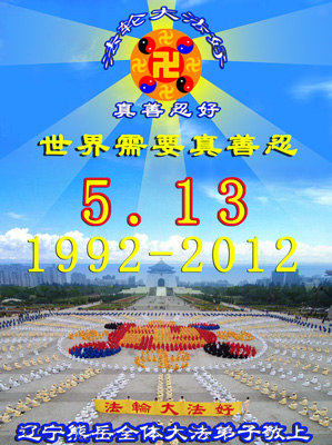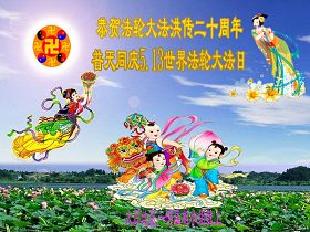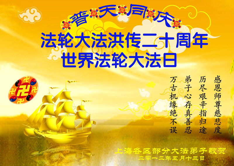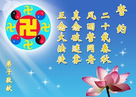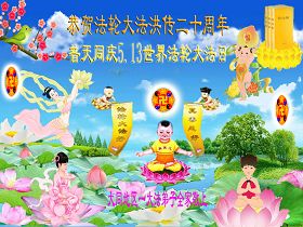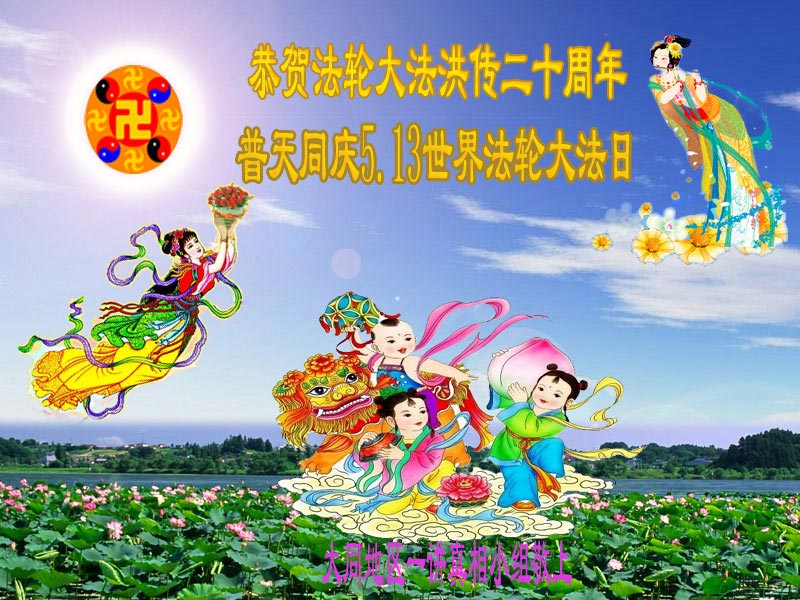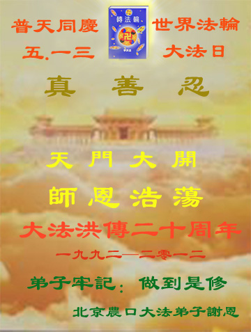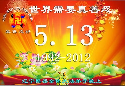 二零一二年五月十三日,是我们慈悲无私的师尊洪传法轮大法二十周年的辉煌节日,在这普天同庆的盛大感恩的日子里,我们每个大法弟子都无限的感恩师尊在人类面临将要淘汰的时候,将宇宙的根本大法——法轮佛法洪传于世,给人类一次最后选择得救的机会。二十年来,师尊为了使弟子们都能够圆满回归,为了使更多的众生能够得到救度, 承受与付出的是无法想象的巨大……。每当读到“为救大穹传天法 众生业债一身当 无量众业成巨难 青丝斑白人体伤”( 《洪吟三》<还原>)的诗句时,弟子们都流下感恩和愧疚的泪水。如果没有师尊对人类的无量慈悲,把这洪大的佛法在世间洪传,人类还会有今天吗?我们还能有幸成为正法时期的大法弟子吗?还能有随师回归的机会吗?没有!什么都没有!为此:我们每个大法弟子都有一颗无限感恩的心,无限感恩师尊的慈悲救度,无限感恩法轮大法的洪传,无限感恩大法赐予我们的无边恩惠。无限感恩师尊赐予我们新的未来。抓紧这最后剩下的不多的时间,救度更多的众生,兑现我们史前的誓约,真正配得上正法时期大法弟子的伟大称号!真正配得上是慈悲无私师尊的弟子!