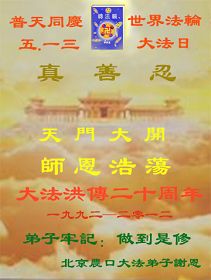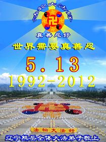 五月十三日是世界法轮大法日,一个全球同庆的节日,二十年前的这一天,李洪志大师将法轮大法公开传世,以真、善、忍的宇宙法理,净化人们的身体和心灵,向世人指明了一条修心向上,返本归真的修炼大道。