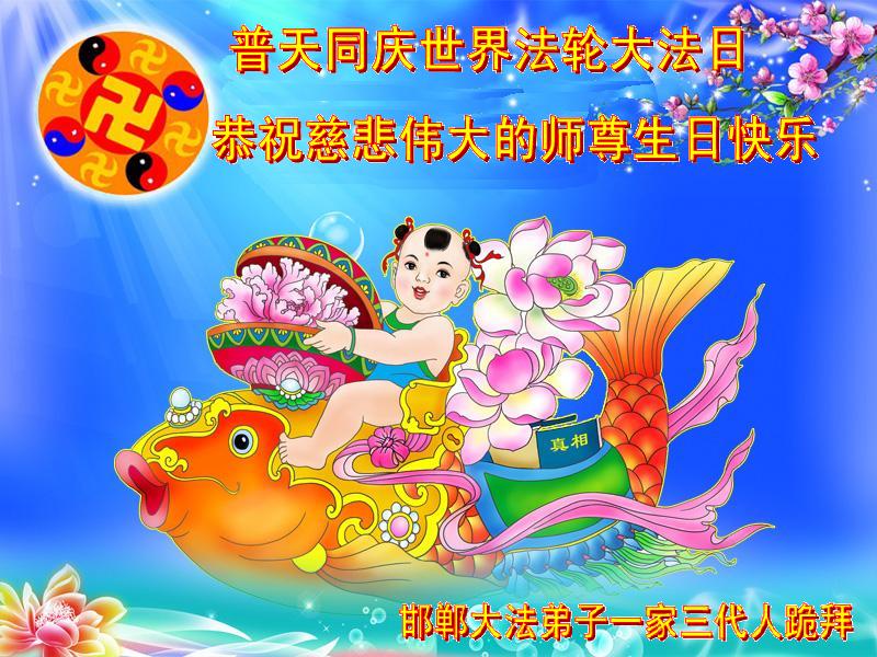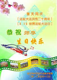 今年“513”是法轮大法洪传二十周年,也是师尊六十一岁华诞,我们家族十几位大法弟子恭祝师尊生日快乐!师父,我们大陆的亿万大法弟子更期盼师尊早日回归中土,与师尊团聚。师父我们想念您啊!(这是我和家人同修写的几首诗词,敬献师尊)