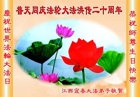 【明慧网二零一二年五月七日】每年的5月13日,世界各地的法轮大法弟子,都向明慧网寄来贺卡贺词,恭贺师尊华诞,并庆祝“世界法轮大法日”。今年的5月13日是大法洪传二十周年纪念日,中国以外的大法弟子纷纷举办各种活动庆祝大法洪传,将“法轮大法好”的信息传给更多世人。中国大陆的大法弟子通过明慧网发来贺信庆祝大法洪传二十周年、庆祝“世界法轮大法日”、恭贺师尊华诞,感谢师父的慈悲救度。这里是明慧编辑部已整理出来的部份东北地区来信汇编: