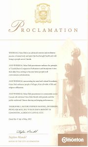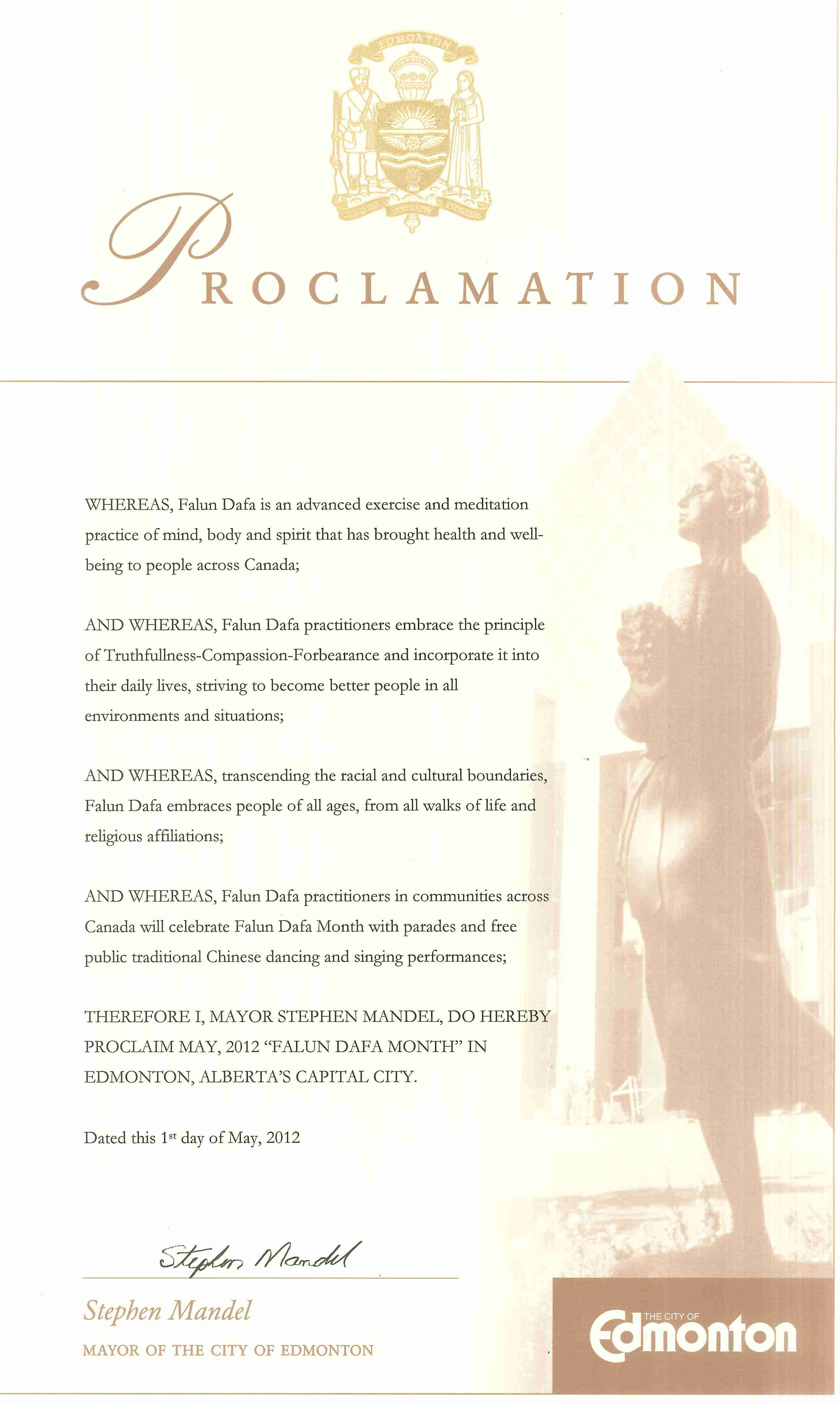 鉴此,我,史蒂芬‧曼德尔,特此宣布二零一二年五月为亚伯塔省首府埃德蒙顿市的“法轮大法月”。
