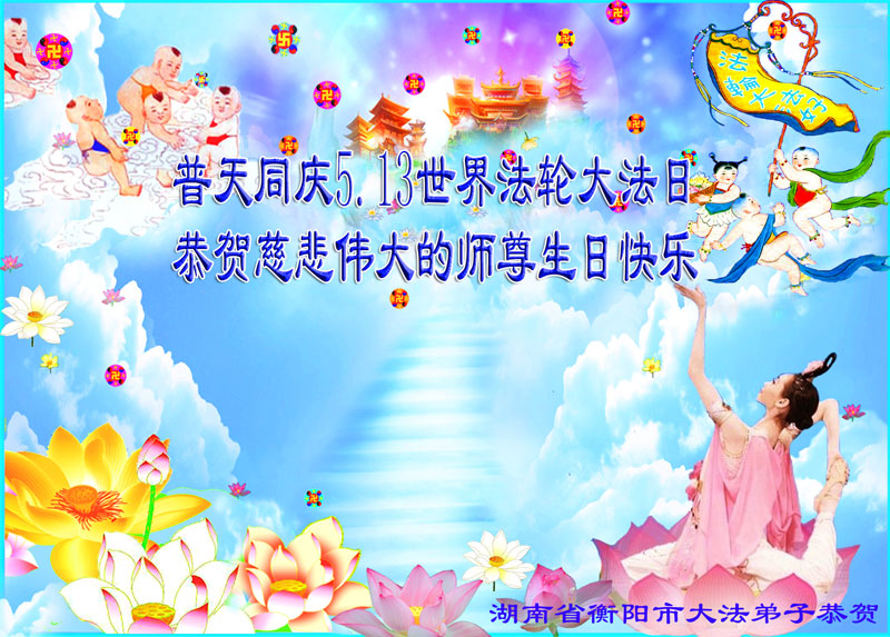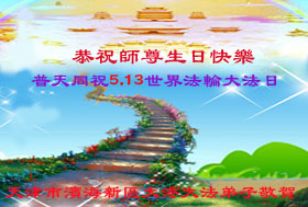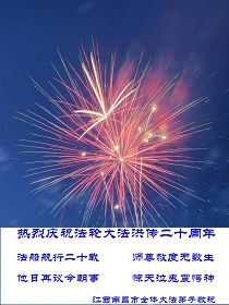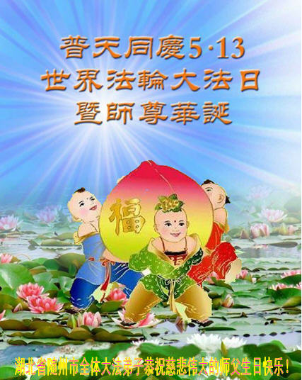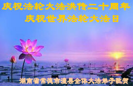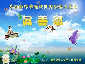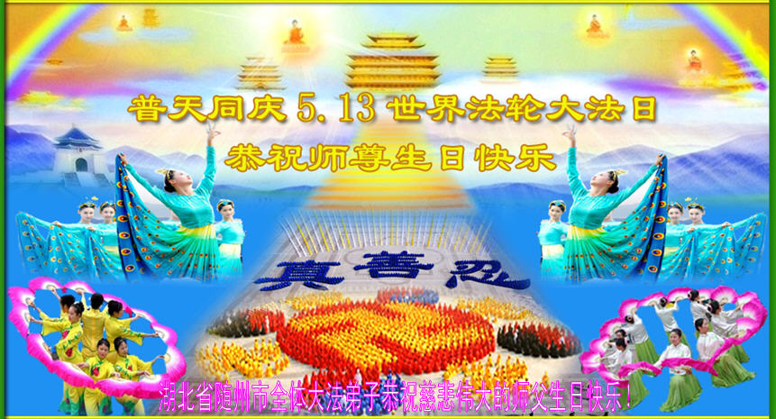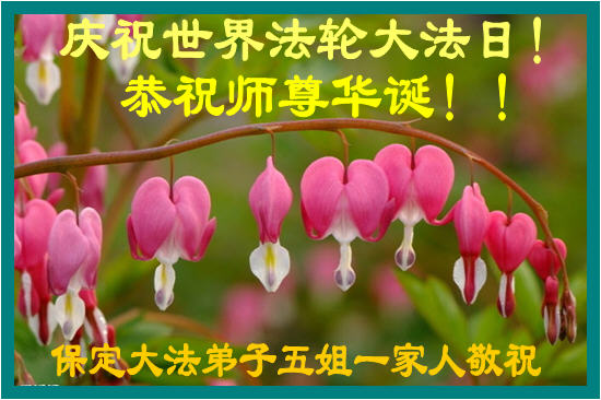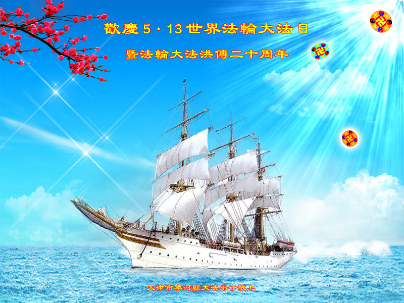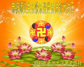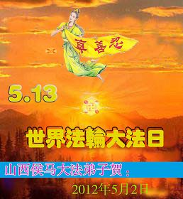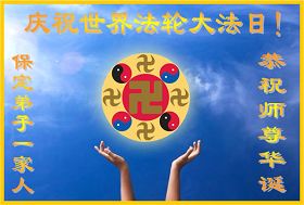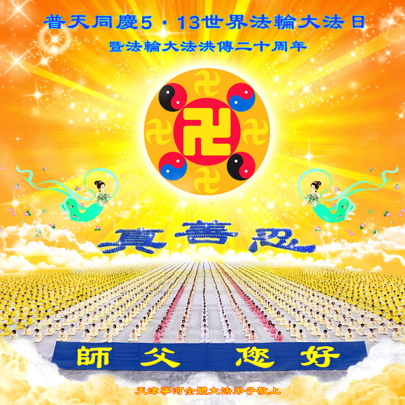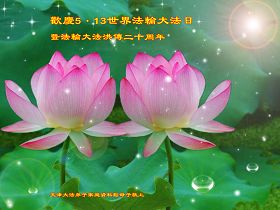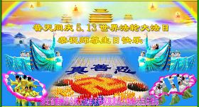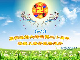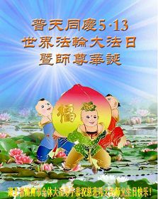 今年的五月十三日,是师尊的法轮大法(法轮功)洪传世界二十周年的日子,是值得每个生命同庆同贺的日子。在这普天同庆的日子里,我们每个大法弟子衷心的感恩师尊的佛恩浩荡!谢谢师尊的法轮大法带给全世界一百多个国家和地区的不同族裔的人身心健康!谢谢师尊的法轮大法洪传二十年来带给大法弟子的身心净化!特别是中共邪恶残酷迫害的十三年里,大法弟子按法轮大法“真善忍”的原则把法轮佛法的美好带给了更多的中国世人与众生,让上亿的中国人远离了中共邪教。得救的世人与众生也明白了法轮佛法才是每个生命的最终归宿。