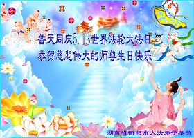 在这普天同庆同颂的神圣节日里,我们恭祝师尊生日快乐!师父您辛苦了,我们众弟子想念您!我们一定精進实修,做好三件事,救度众生,圆满回家。c