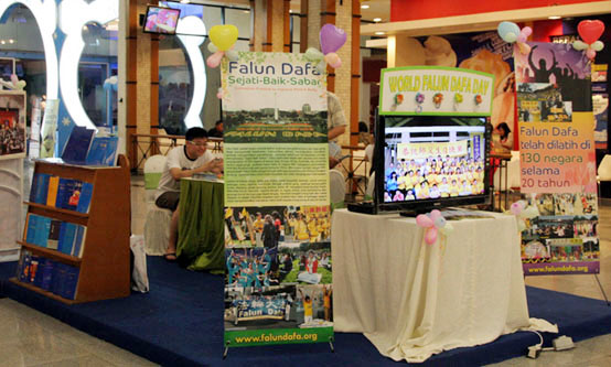 在展位上,学员们摆放了一个大屏幕电视机,播放关于法轮大法弘传世界的录像片,有的学员在一旁演示法轮功五套功法,不少观众驻足观看,并询问什么是法轮功。