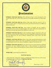 鉴于,自从罗格斯特大学于一九九六年第一次介绍法轮大法以来,通过在全新泽西州图书馆、社区中心、老人中心和其它大学举办的免费讲座和教功,法轮大法触动了众多新泽西居民的心灵。