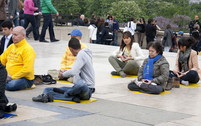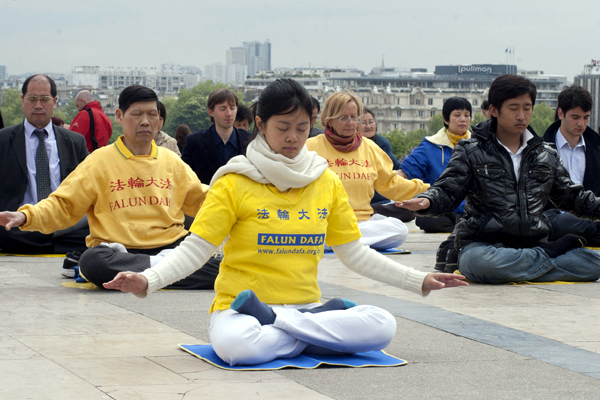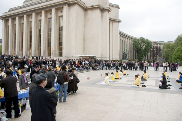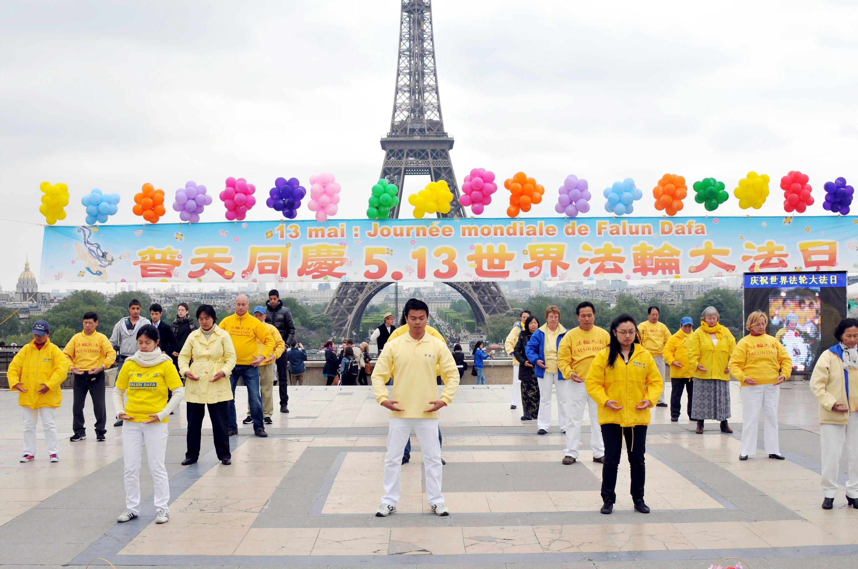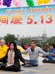 ![]() 庆祝世界法轮大法日,法国法轮功学员聚集在巴黎埃菲尔铁塔边的人权广场集体炼功。 |