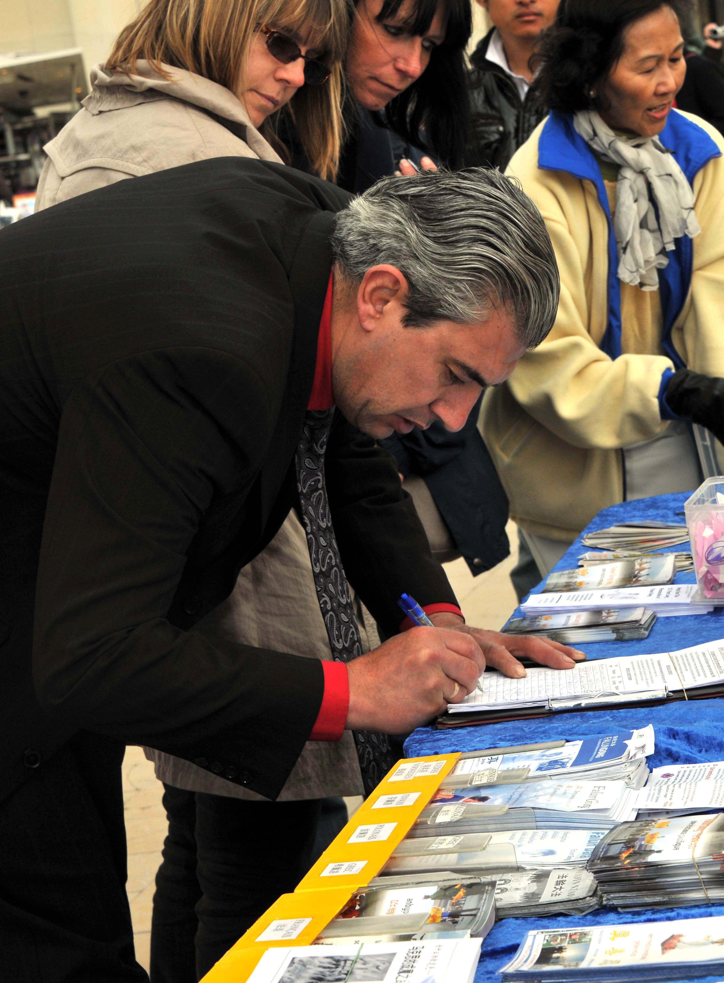 年轻的法国人Mehmet和法轮功学员一起学炼动作,从第一套功法一直到第五套功法,并且第五套功法能双盘。参加完功法演示后,他在支持法轮功的签名簿上签下了自己的名字。