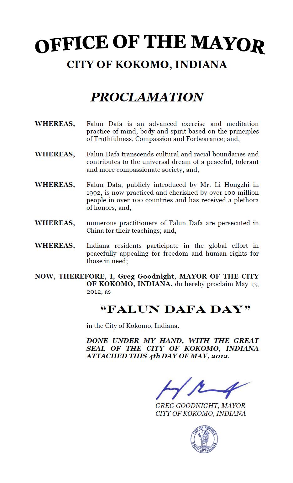 鉴此,我,印第安纳州科科莫市市长格雷格•顾德乃特,特此宣告二零一二年五月十三日为印第安纳州科科莫市