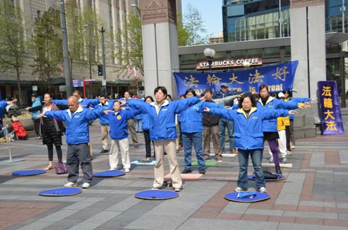 随后在祥和的音乐声中,法轮功学员身穿写着“法轮大法”的蓝黄色夹克,在公园的中心广场,炼着舒缓的法轮功五套功法。