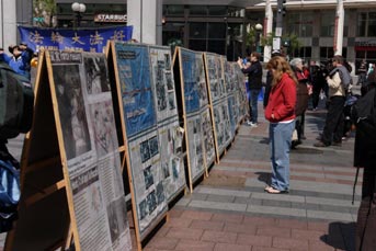 ![]() 路人驻足观看展板、接过法轮功学员派发的真相资料阅读、签名声援制止迫害 |