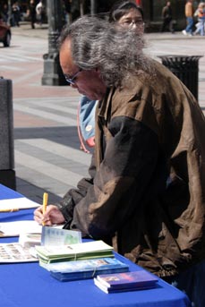 在广场的一侧,学员们摆放了两长排展板,介绍大法从中国传向西方,以及中共对法轮功残酷迫害的事实。展台上还陈列了各种介绍大法的资料。许多路人或驻足观看展板,或前来询问拿取资料,并在声援制止迫害的征签表上签名。