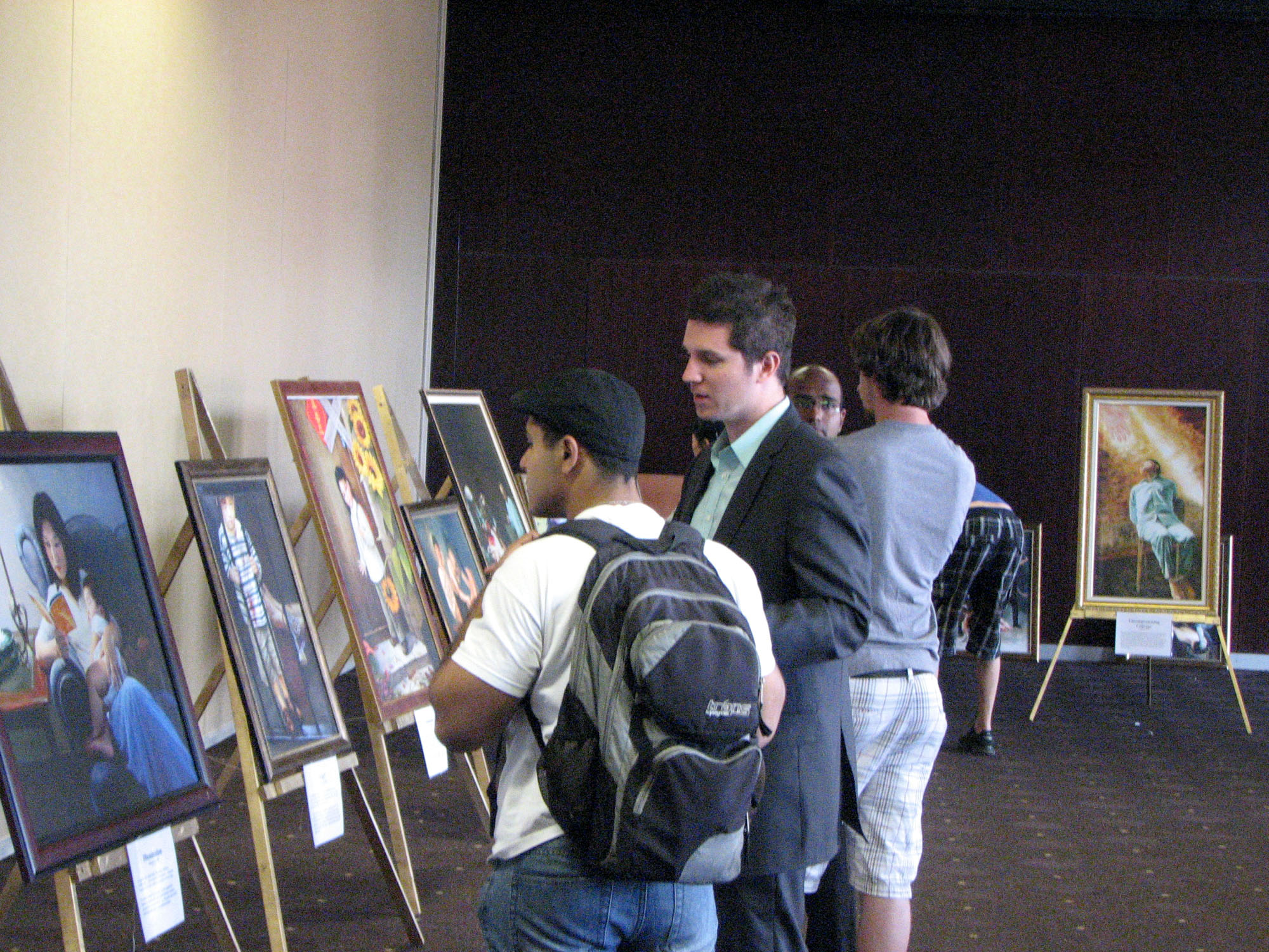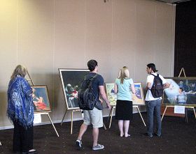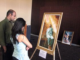 在第二天傍晚,真善忍美展到了结束的时间了,这时有二名大陆留学生急匆匆地走进展览室要参观画展,他们是刚刚看到海报而知道这一消息的。二位年轻人非常专心地听解说员介绍每一幅画的意境。画展中摆出来的第一幅画是《誓约》,说的众神从天上下世到人间的古老传说,这幅画要表达的主题是,人的生命来源是非常珍贵和神圣的,来到地上,通过修炼,他们还要回到天上的家。每一幅画,都有一个美好的意境。看完美展,他们表示收益匪浅。并表示要退出中共的附属组织共青团和少先队。