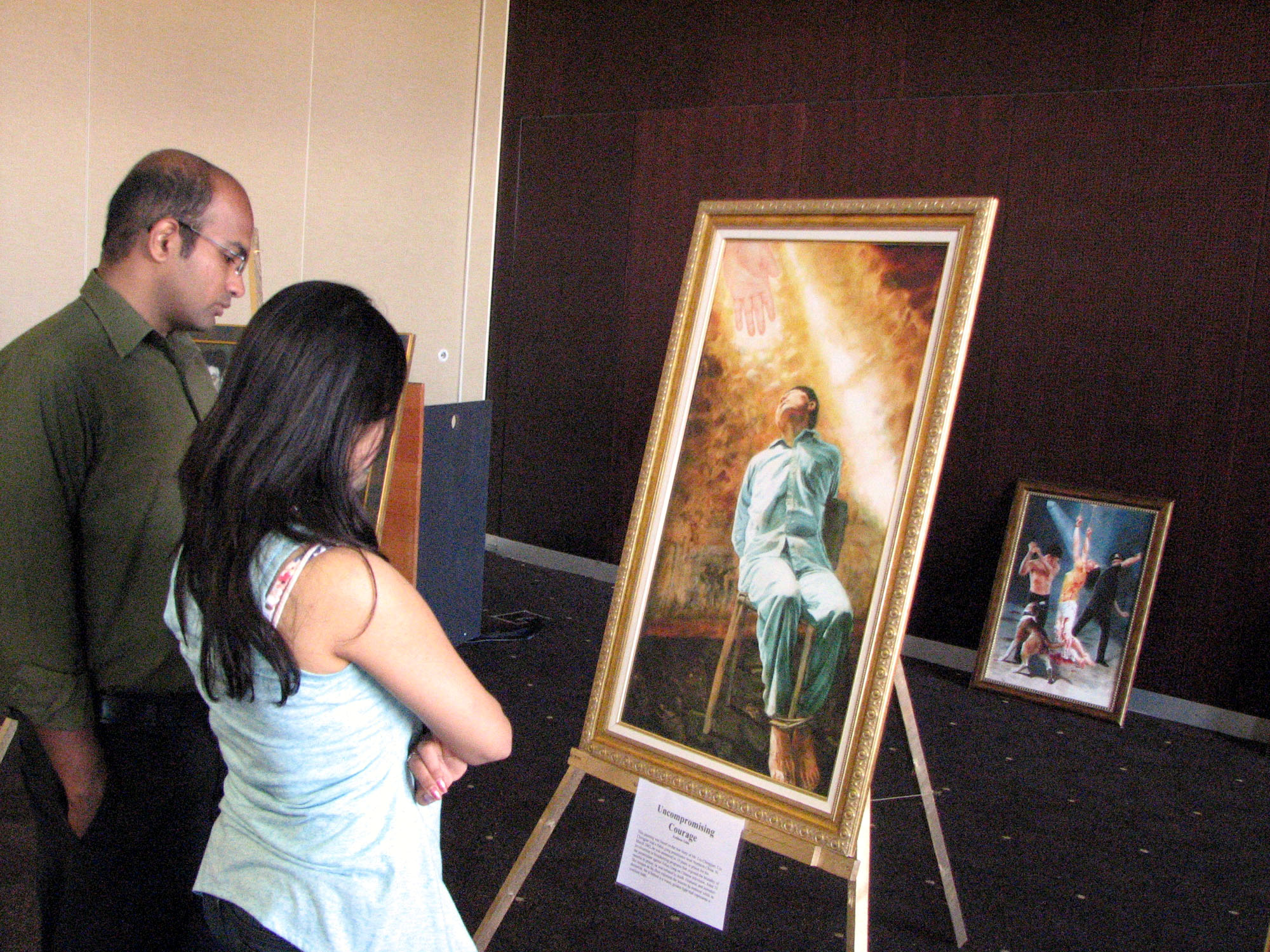 大陆留学生林女士(化名)是物理系的研究生,看画展非常认真,边看边向讲解的工作人员提问。她问为什么只有法轮功受迫害?工作人员告诉她,除了法轮功,许多宗教团体和气功团体也同样遭受中共迫害。实际上从一九四九年中共统治中国后,几乎各个阶层的中国人都曾遭受过中共的迫害。她又问,为什么会发生天安门自焚?工作人员告诉她几个常识:第一,在公共场所不管是谁自焚,在自由社会人们都会同情自焚者,而不会去谴责他们。这是一个正常社会民众的正常心理状态。第二,我们知道自焚者从点火到焚烧,只要十几秒钟就可导致严重烧伤和死亡。但天安门自焚几秒钟就有警察背着灭火器来灭火,通常警察是不背灭火器巡逻,这不管是中国还是其它国家都是如此,除非你是消防员。如果从天安门广场最近的建筑物去取灭火器,即使是百米短跑健将,也需要花一些时间才能把灭火器取来。在自焚现场,还有摄像者在近距离多角度拍摄自焚者被焚烧,及警察用灭火器灭火的镜头。除非是事先知道有这件事发生,摄影者等候在现场拍摄,也不可能近距离来拍摄。第三,那个小女孩严重烧伤,气管切开还能大声唱歌显然是骗局。林女士知道了这是中共为迫害法轮功而设下了骗局。她表示要花时间好好了解法轮功,并当场表示要退出中共的附属组织——共青团。