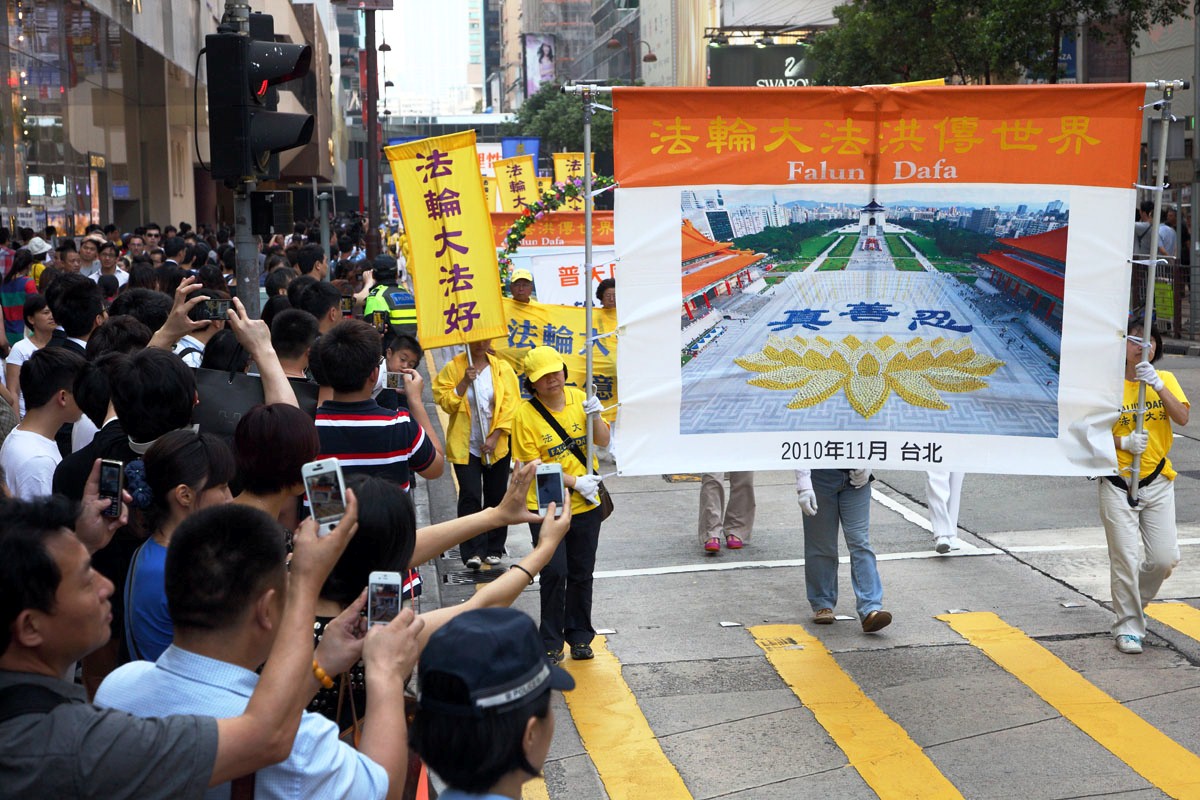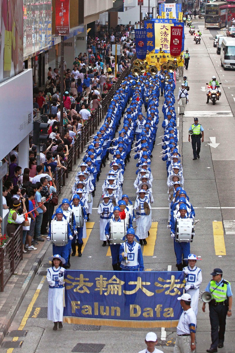 下午二点,庆祝大法洪传二十周年的游行开始,在天国乐团领头下,游行队伍浩浩荡荡的沿着九龙区的闹市缓缓前进,途经深水埗、旺角、油麻地、尖沙咀等繁华路段,各式弘扬大法、反对迫害及声援退!党!的幡旗横幅,以及雄壮响亮的鼓乐声,吸引沿途的香港市民及中外游客驻足观看,纷纷拿出相机、手机拍照留念。