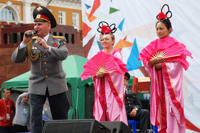 【明慧网二零一二年六月一日】二零一二年五月二十七日,在俄罗斯克里姆林宫旁的莫斯科红场,法轮功学员应当地高阶特警单位邀请,参加了第八届军事运动节大型庆祝活动。身着警服的主持人在介绍法轮功团体时说:“首先出场表演的是‘伟大及强大的法轮大法’学员。”据了解,此次法轮功学员是被一个高阶特警单位的交响乐团的指挥邀请,活动组织者表示,接连数日在红场举行的活动吸引了近十万人参观。