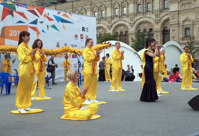 法轮功学员组成的腰鼓队及舞狮不断地围绕红场游行了四个小时,精神抖擞,击鼓震天。大法弟子们献出了舞蹈《法轮大法好》,《净莲》,歌曲《给人类的一封信》等文艺节目。现场的学员还进行法轮大法五套功法的演示。另外,一旁设有十五张桌子来摺纸莲花。由于索要者众,许多人根本无法接近折莲花的桌子。