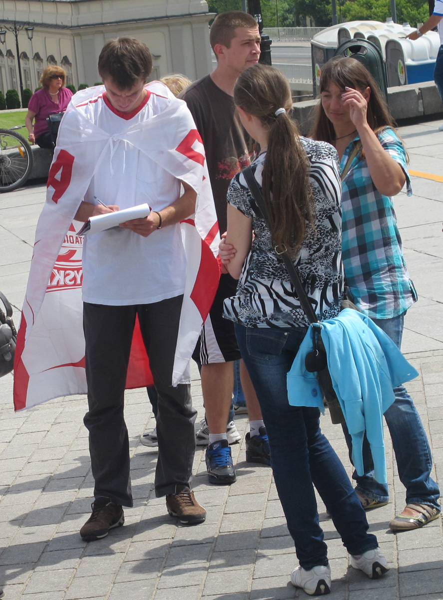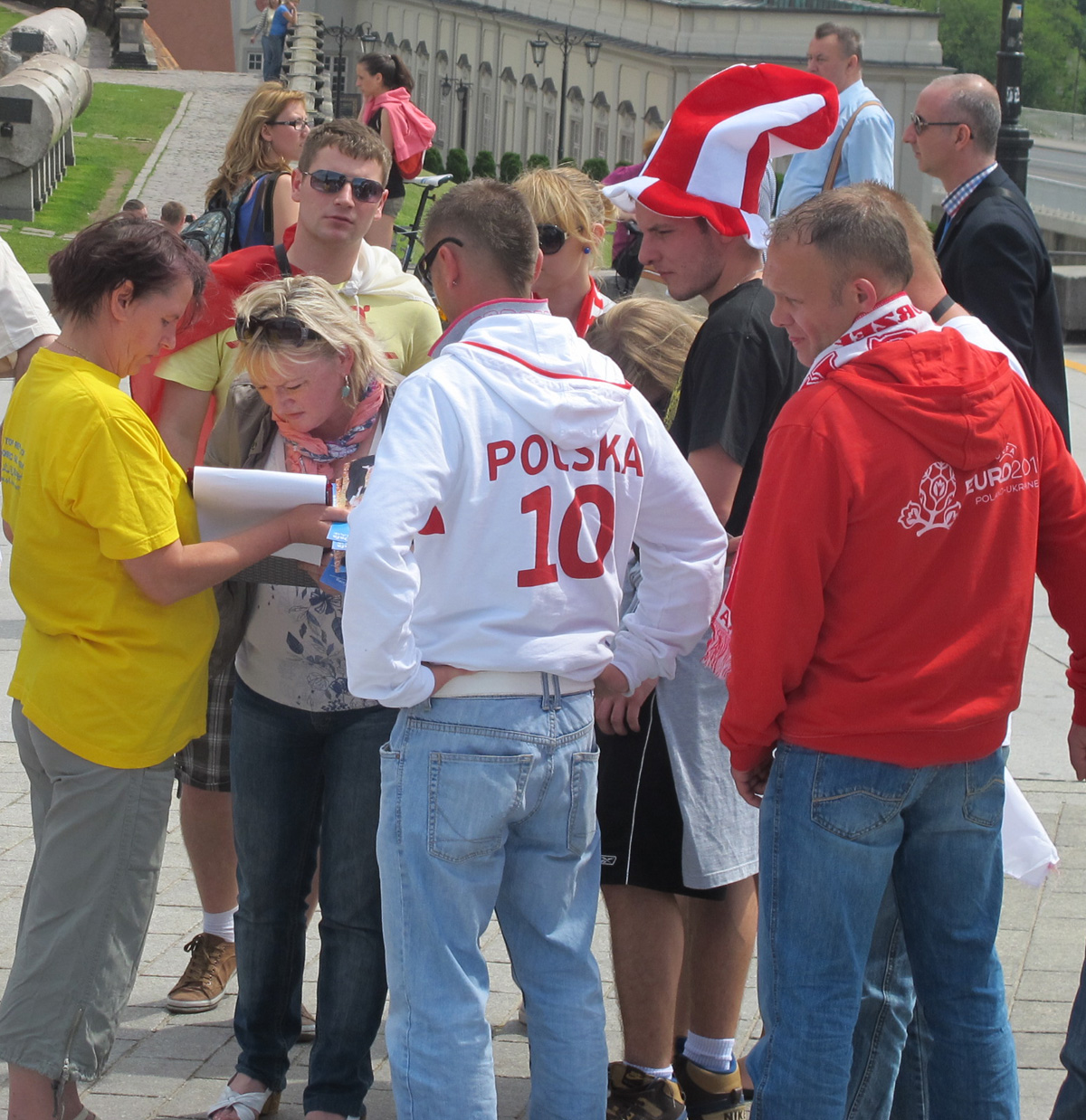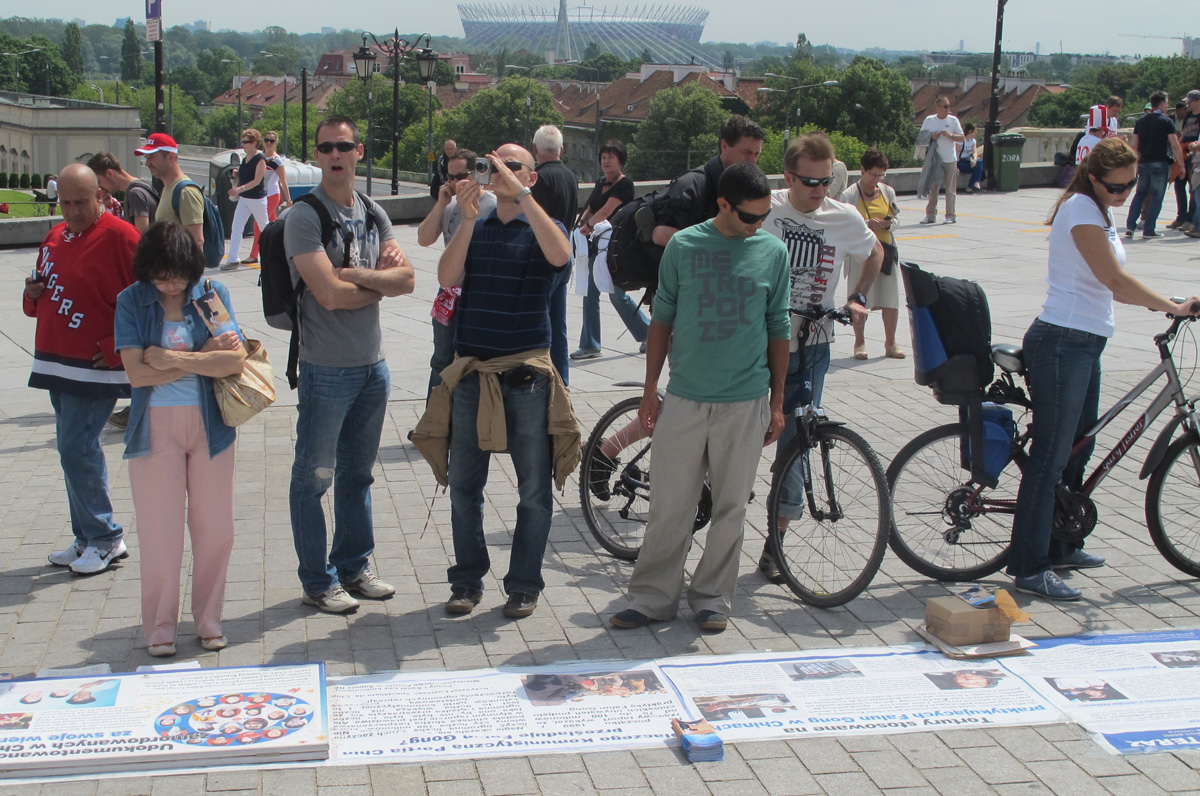 波兰法轮功学员也借此机会来到古城广场弘法,考虑到来自欧洲各国球迷语言的不同,波兰法轮功学员准备了中文、英文、德文、法文、俄文、波文和意大利文等多语种真相传单,并在头一天下班后聚集一起连夜赶制了一幅中英文“法轮大法好”横幅。