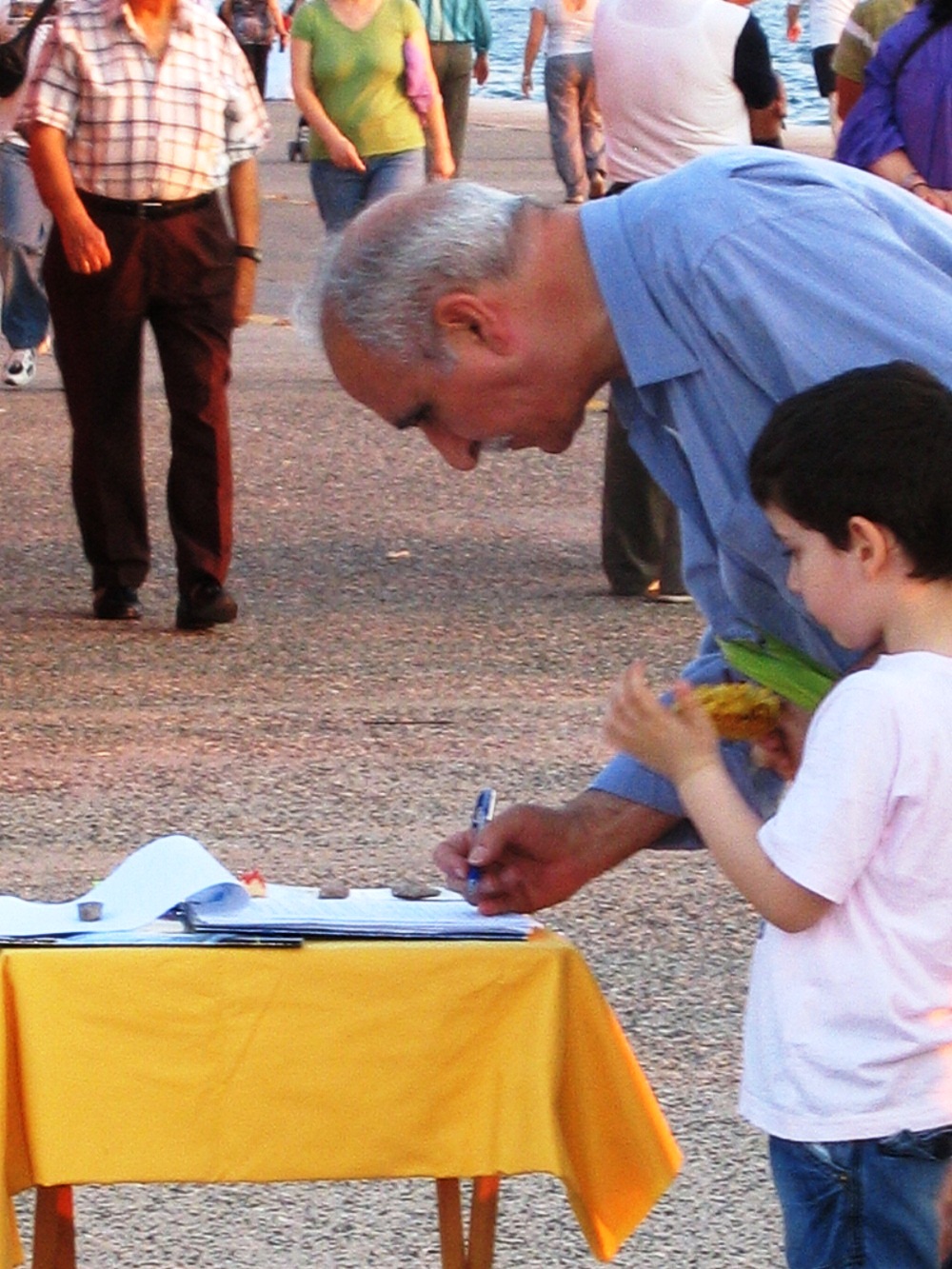 下午四点左右,希腊三大政党之一的新民主党主席康斯坦丁•格欧勒卡斯(Constantine Gioulekas)路过市中心的洪法点时,一位学员过去给他和他的一行人讲真相,递给他们相关资料。格欧勒卡斯说他没听说过法轮功,当他和他的一行人了解到中共还在残酷迫害法轮功,感到很吃惊。其中的一位女士问怎么才能帮助被迫害的法轮功学员?学员建议他们可以签名反迫害或者在网站上签名表示自己的态度,他们欣然同意上网去签名。
