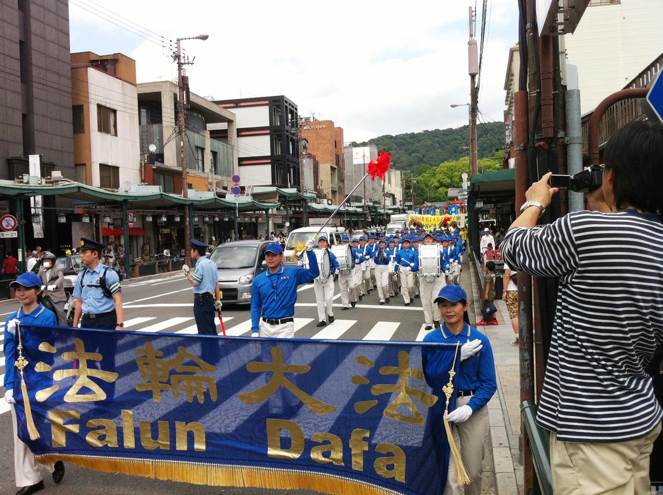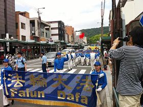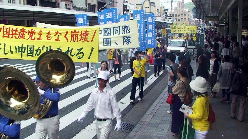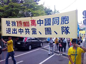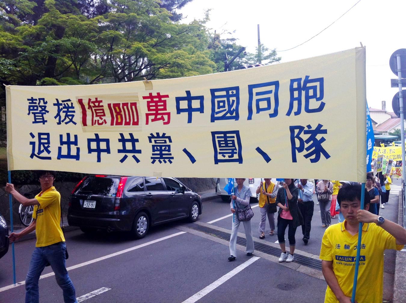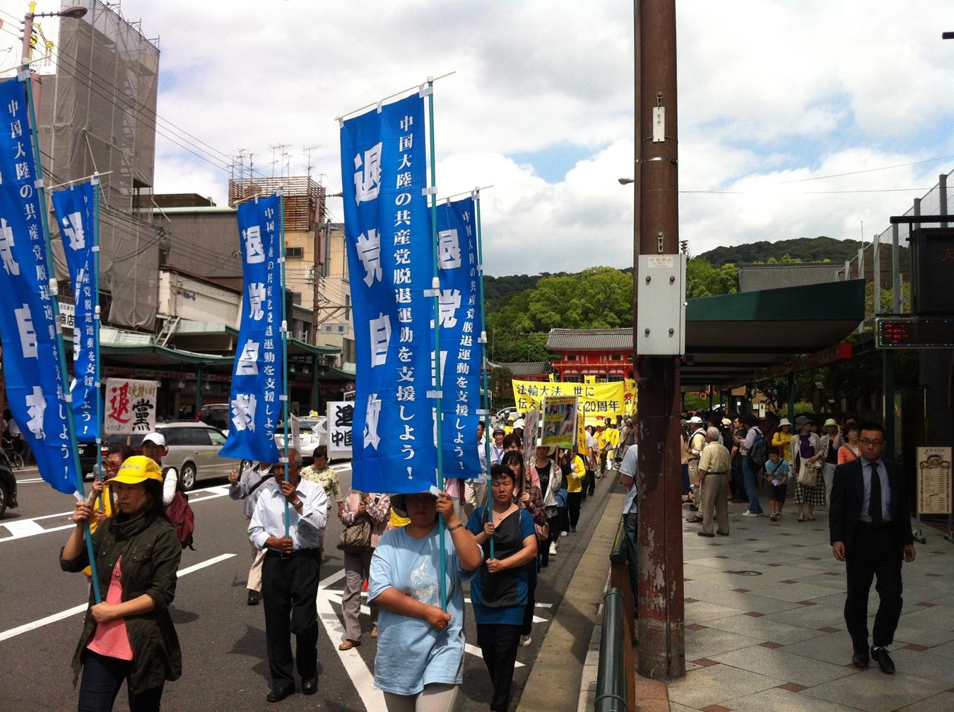 游行队伍由八十多名成员组成的天国乐团带队,显得格外庄严神圣,随后是声援退出中共党、团、队(简称“三:退.”)的队伍。他们手举着中日文制成的“声援一亿一千八百万勇士退出中共党、团、队”,“中国共产党即将崩溃,新中国即将诞生”,“天灭中共,退!党!自救”,“爱国不等于爱党”,“停止迫害法轮功”等旗帜和标语牌,很是引人注目。