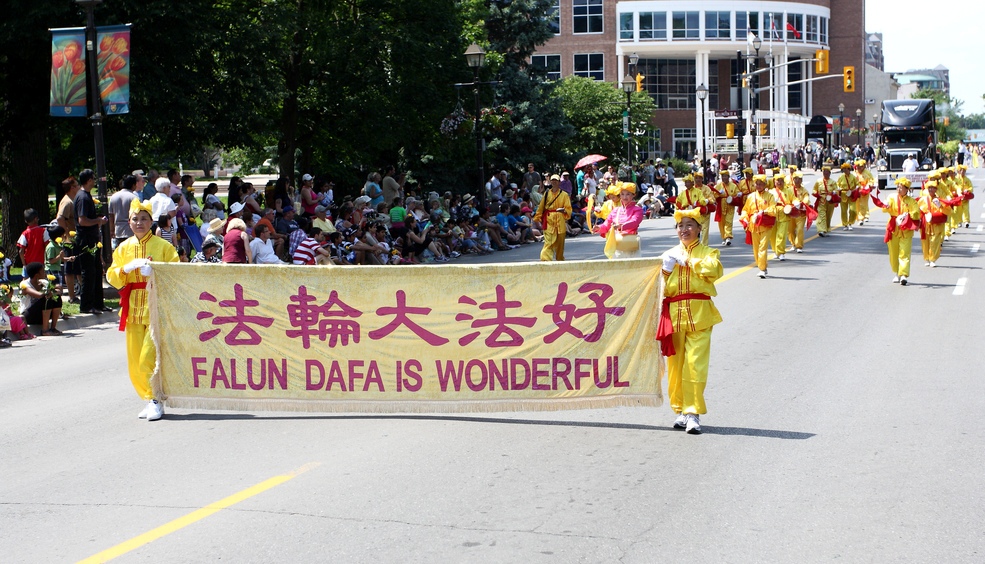 十六日下午在布兰普顿市迎接花季来临的游行中,身穿亮黄色服饰的法轮大法腰鼓队和天国乐团一同出席,沿途吸引了众多游客拍照留念。