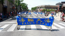 上午十一点开始的伯灵顿音乐节游行,有来自加拿大及美国的多个乐队参加,法轮功天国乐团是众多游行团体中唯一的一个华人乐团,今年是第三次应邀参加伯灵顿市的音乐节游行。