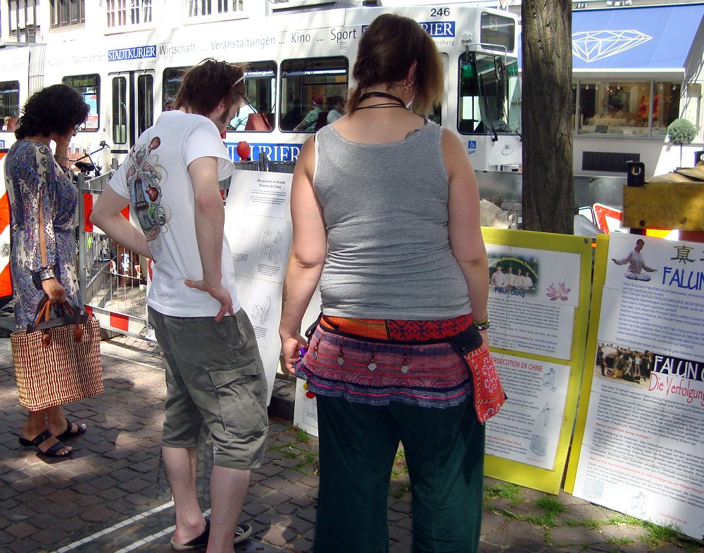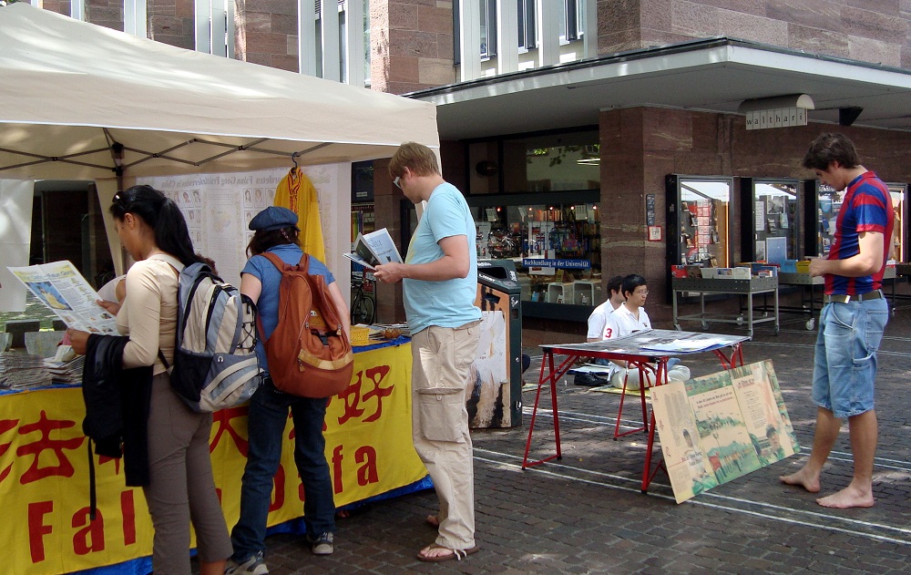 两位来自秘鲁的女士现在在弗莱堡工作,她们听说法轮功后立刻产生了很大的兴趣,询问了很多关于法轮功的功理、功效方面的信息,并拿了很多资料高高兴兴地离开了。没过多久两位女士又回来了,询问在当地是否有炼功点,她们决定要学功。学员把炼功时间、地点等信息写给她们,约好下次炼功时再见。