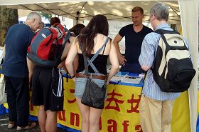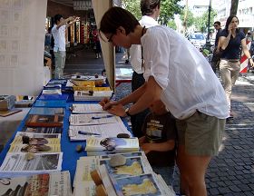 一位年轻的姑娘接过法轮功学员递给她资料时问:“这是什么?”学员告诉她这是介绍法轮功在中国被迫害情况的信息。有成千上万人被关进监狱、劳教所、精神病院,或被迫害得失去工作、流离失所,还有的法轮功学员被活体摘取器官。姑娘问:“我能做些什么呢?”学员指着马路对面的信息台说:我们在征集签名,向各界呼吁制止中共对法轮功学员的迫害。那姑娘穿过马路来到信息台前,郑重地签上了自己的名字。