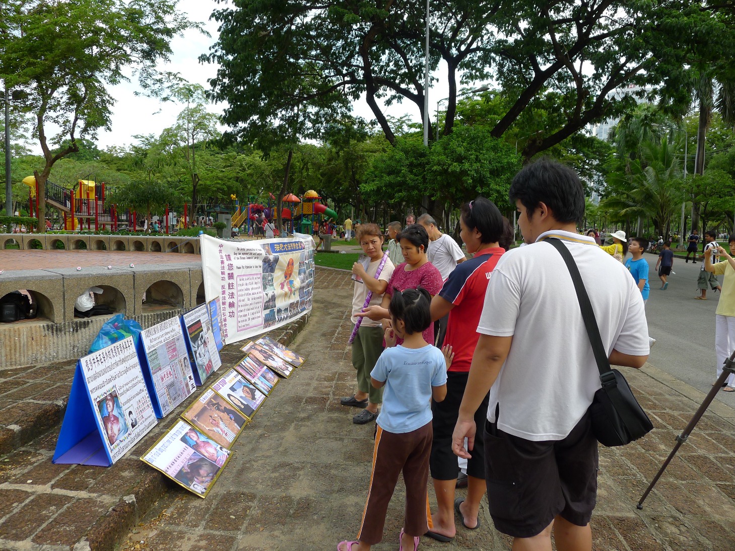 图片:大陆游客在泰国景点观看法轮功真相展板