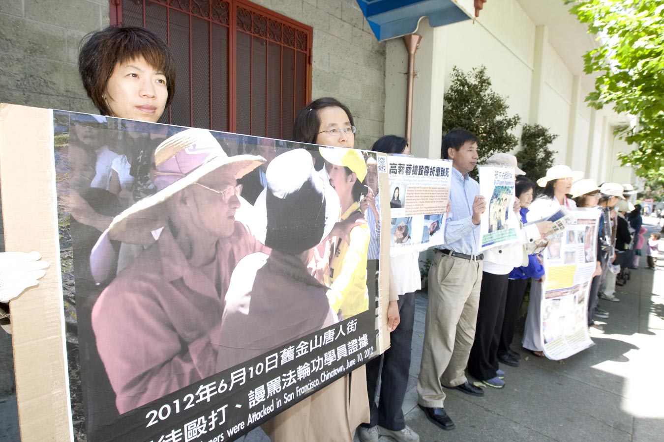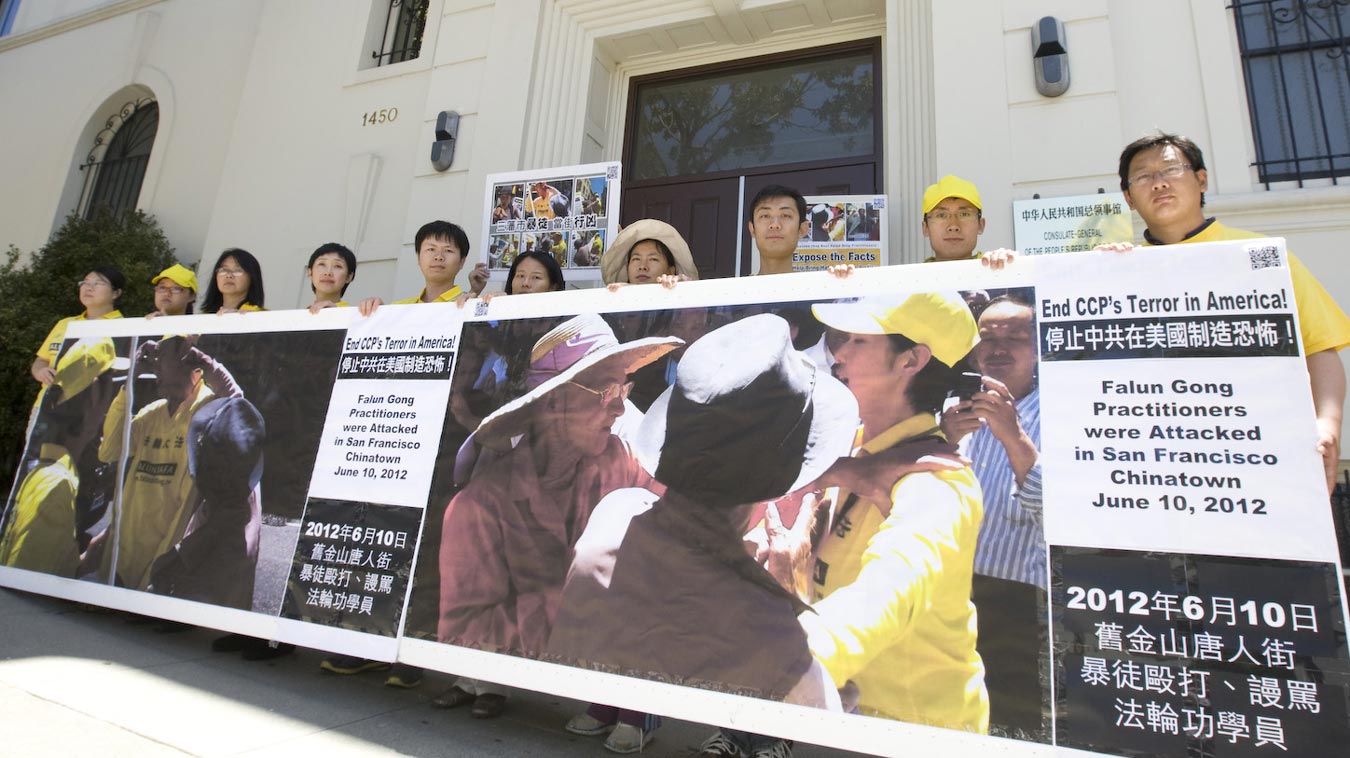 当日中午,来自湾区的一百多名法轮功学员在中领馆前,正告中共停止在旧金山迫害法轮功。他们举着法轮功学员被暴徒袭击的证据,呼吁民众关注这一系列发生在中国城对法轮功学员的攻击事件。暴力攻击事件受害人黄女士对导致打人事件的幕后黑手--中共驻旧金山领事馆表达强烈谴责。