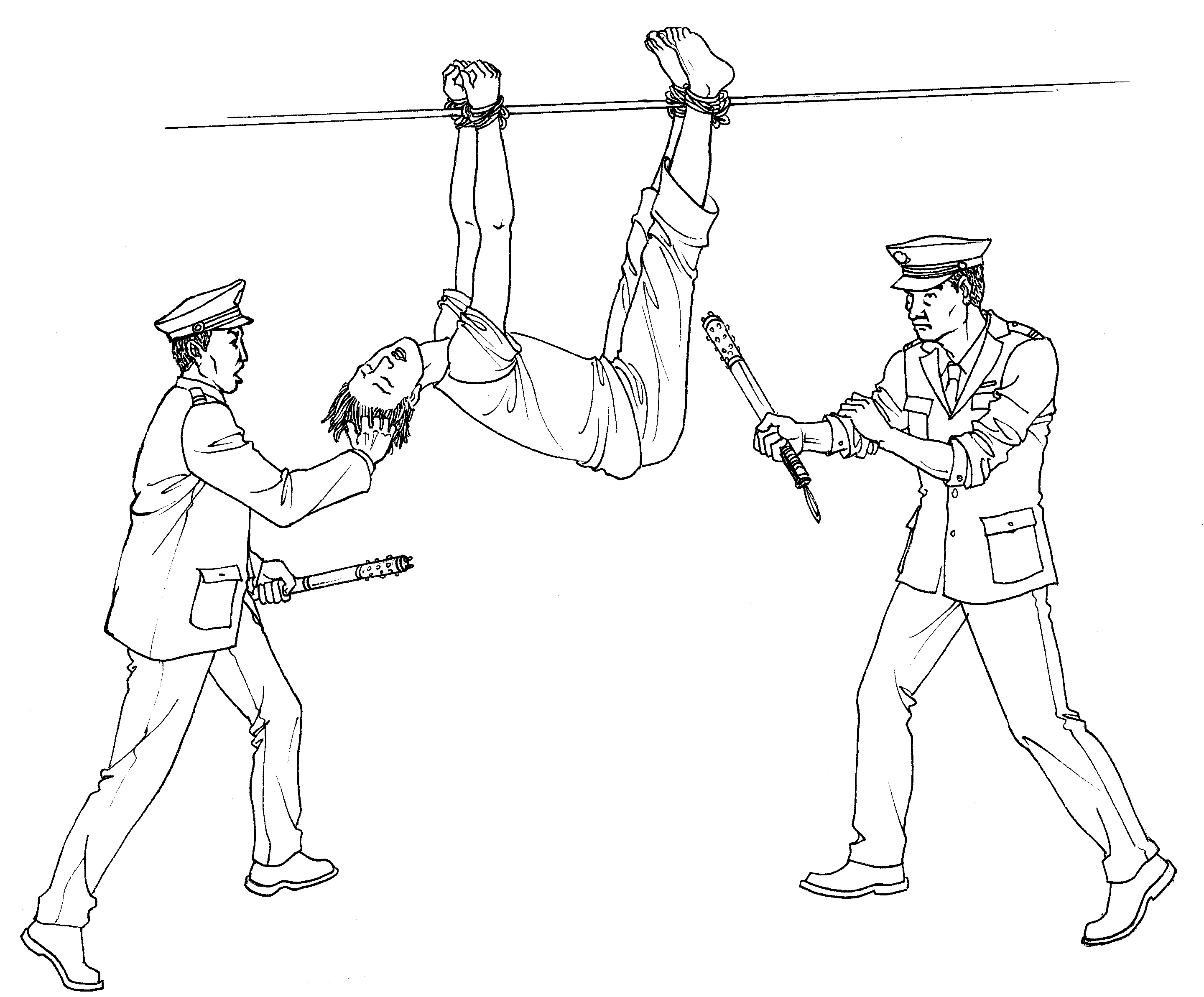 人为窒息:恶警用塑料袋套头使人不能呼吸,拳打脚踢,用电警棍电击,手段极其残忍。受害严重者窒息身亡。
