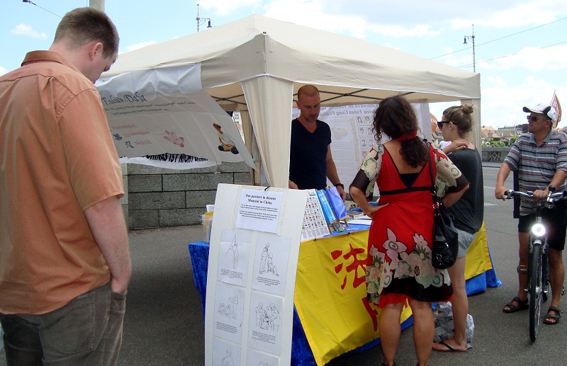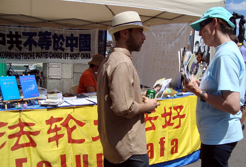 信息台帐篷外,中、德双语的醒目横幅“中共不等于中国”、“解体中共 停止迫害”和“法轮大法好”吸引来四面八方的行人。有人穿过马路,跨过大桥,甚至从公交车上跳下来,到信息台前了解详情。