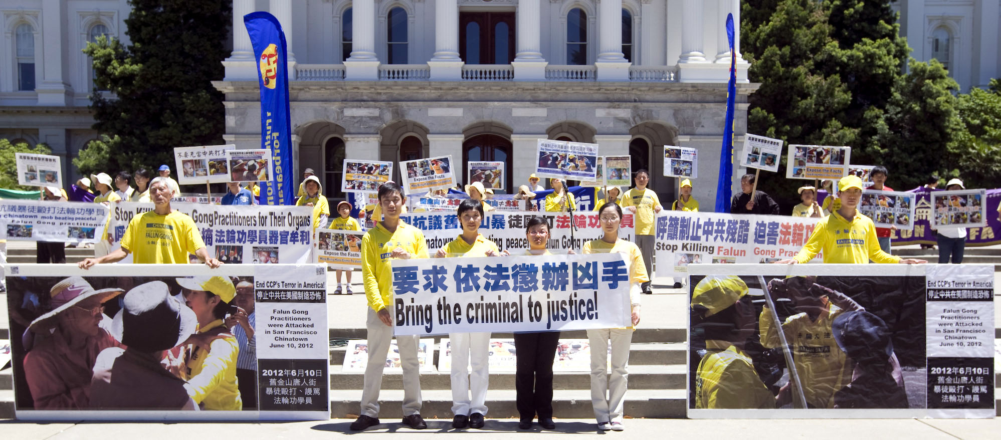 二零一二年六月二十七日,旧金山湾区部份法轮功学员来到加州首府沙加缅度举办集会,呼吁州府官员敦促旧金山市长、市议会、警察局、地检署彻底调查中共帮凶打人事件,将凶徒绳之以法。