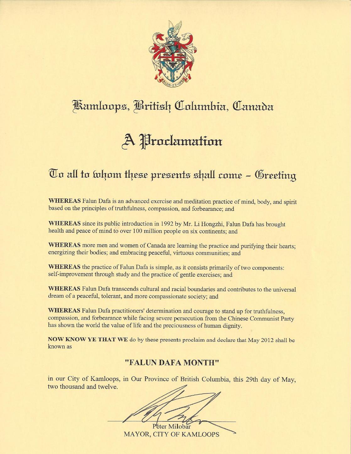 鉴此,我们颁发此褒奖,宣布二零一二年五月为卑诗省甘露市的法轮大法月。