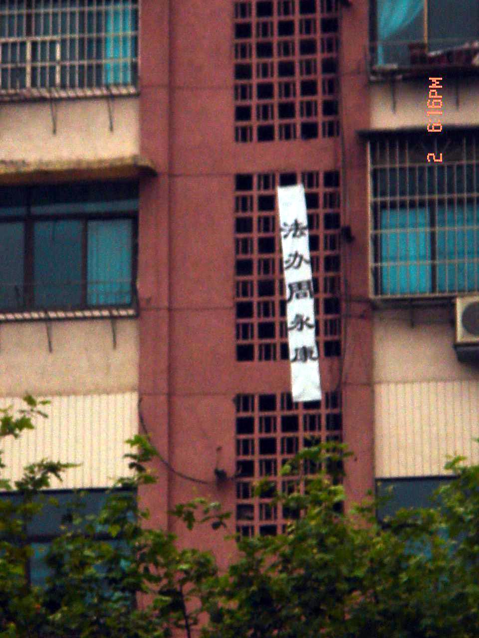 ▽ 二零一二年五月,湖北宜昌市葛洲坝各个单位,居民社区,在邪*党-葛洲坝集团公司六一零,葛洲坝反邪教协会指使下悬挂污蔑大法横幅。已知:葛洲坝房地产公司佳鸿办公楼门口,二公司大堰湾居委会云林小区办公楼门口,一公司金利源酒店背后肖家岗常家湾居委会门口,三江桥头居委会机电公司社区门口,毒害工区老百姓和世人。