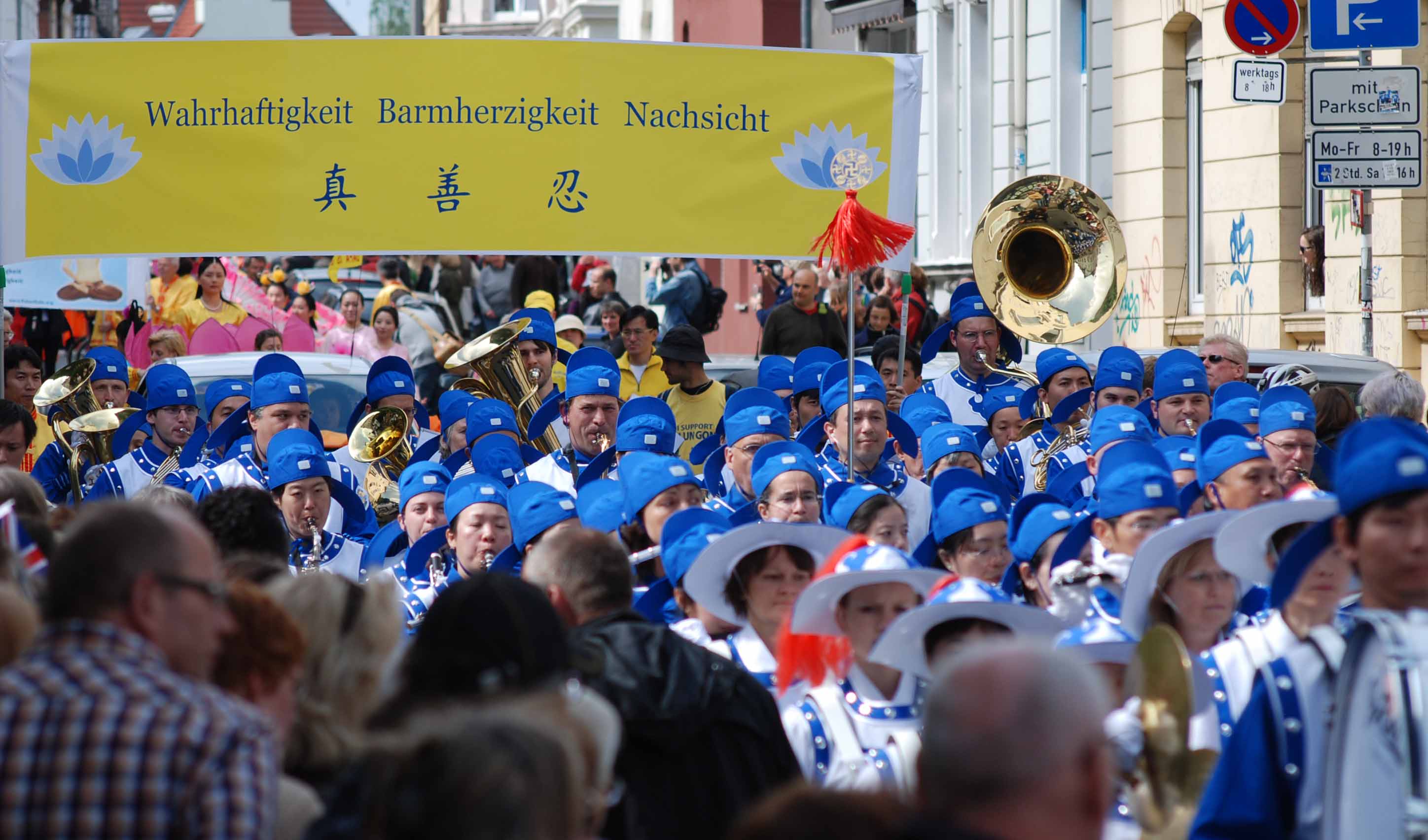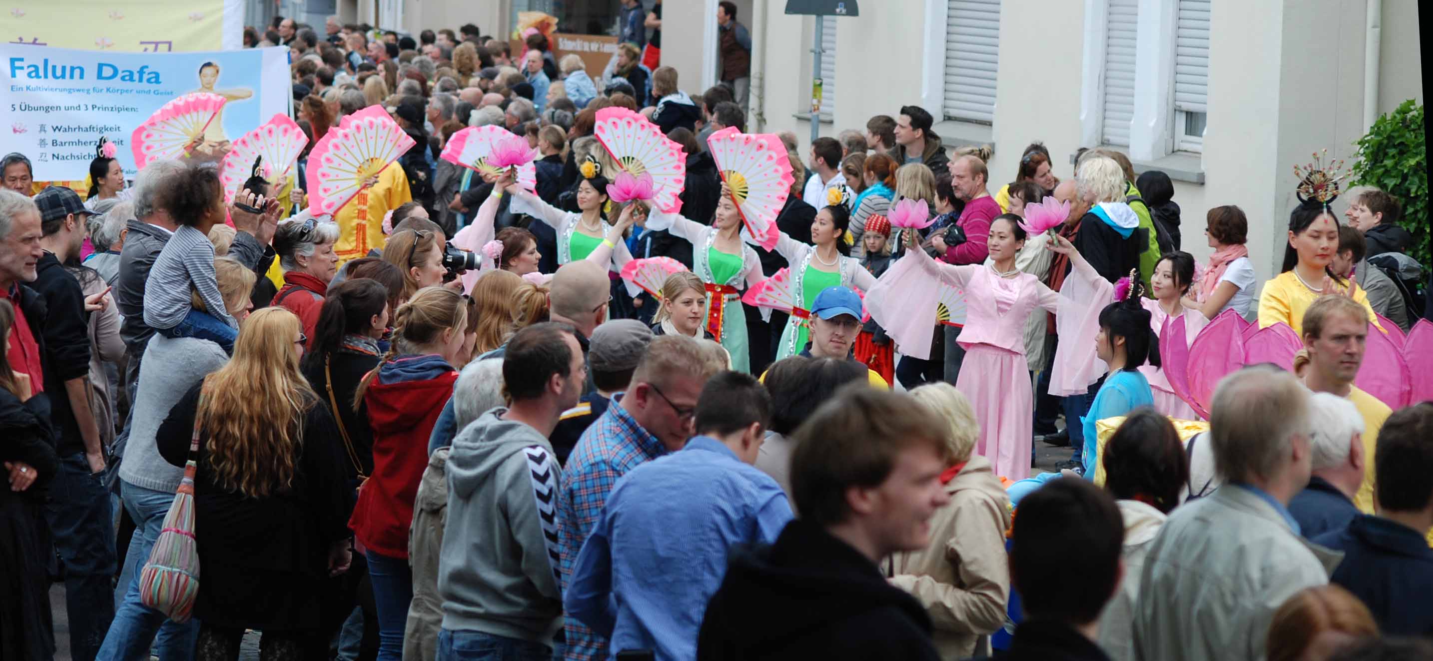 正是春意盎然时。丽日和风下,居民们在队伍必经之处早早占据有利地形,或是几把椅子占在人行道边的第一排,或是三三俩俩地喝着汽水边等边聊。下午两点钟,游行队伍从Melanchton 大街出发,穿过比勒菲尔德的新老城区。马路两边水泄不通,挤满了市民。欧洲天国乐团身着蓝白相间的古装,紧接其后的是金黄花车上舒缓优美的功法演示。粉裙飘飘的扇子舞队清丽脱俗,轻摇绸扇,让久盼的观众耳目一新。而压阵的则是几面大横幅,揭露中共活体摘取法轮功学员器官牟取暴利。