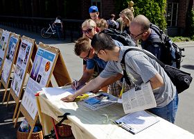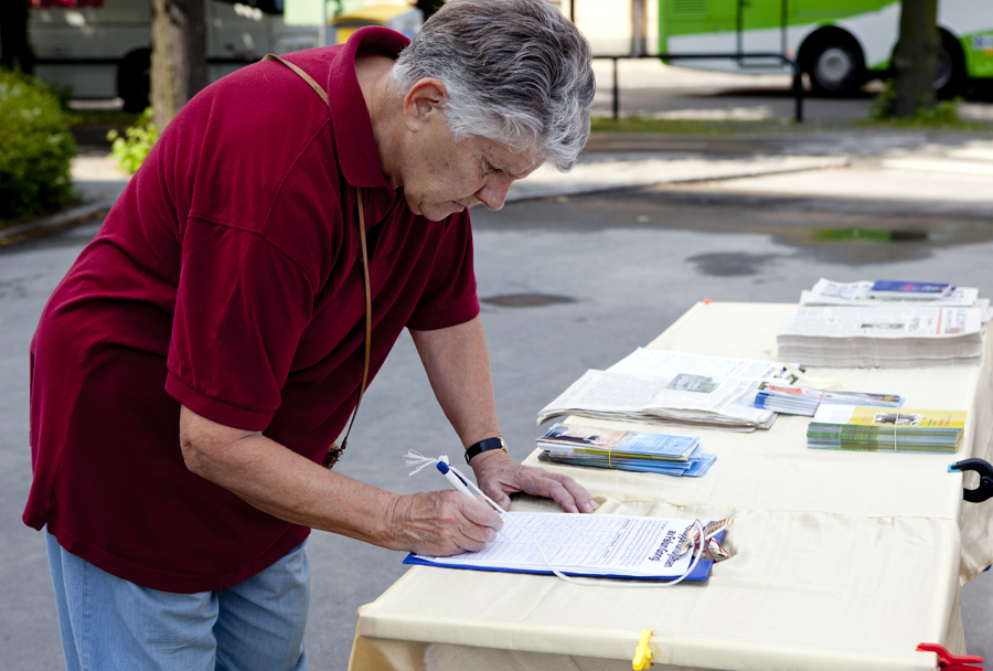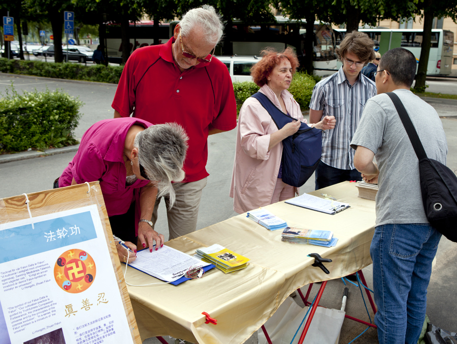 还有一位瑞典女士,骑自行车骑得满头大汗的来到活动场地,下车就找学员要签字支持法轮功,还问学员,她丈夫有事没来,她还想替她丈夫签字可不可以?当得到允许后,她很高兴。她说她以前拿到过法轮功真相小册子,看了之后全明白了,这次赶来就是要签字表示一下他们反对这场迫害、支持法轮功。那位女士还对学员说,“你们是做了最好的事了”。