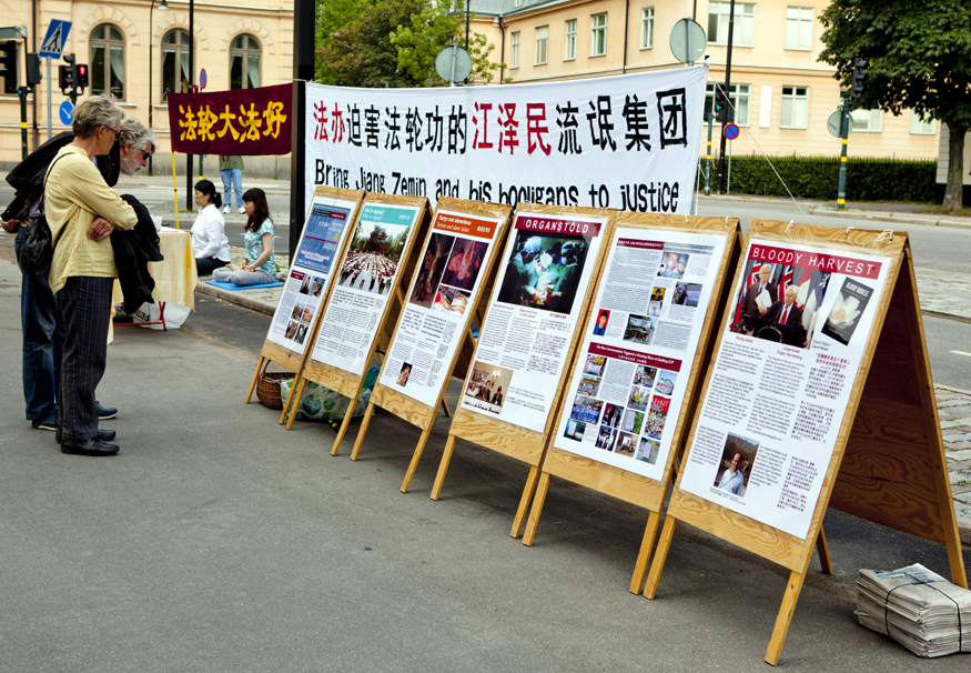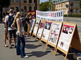 二零一二年七月七、八日这两天,瑞典法轮功学员利用周末假日,在斯德哥尔摩享有“水上天鹅”之称、造型别致的市政厅旁举办了洪法讲真相活动。在活动现场,法轮功学员挂起了“法轮大法好”、“法办迫害法轮功的江泽民流氓集团”醒目的横幅,整齐地摆放着法轮大法洪传全世界以及法轮功学员在中国遭受残酷迫害的真相展板,吸引着众多的游人驻足观看。有很多的旅游大客车、公交车都要经过这里,法轮功学员讲真相的活动场地给这一著名的旅游景点增添了特殊的光彩。
