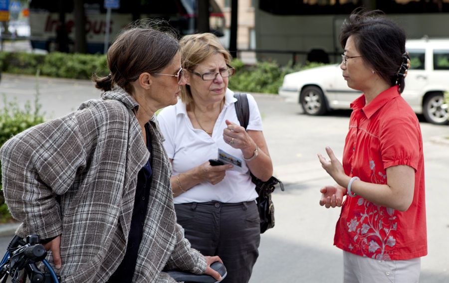 还有一位很有风度的中国老人,她居住在斯德哥尔摩已经有三十多年了,当她从学员手里接过真相资料时,微笑着说,“我很佩服你们(法轮功),中国就因为有了你们(法轮功),才有了希望!我会永远支持你们!”