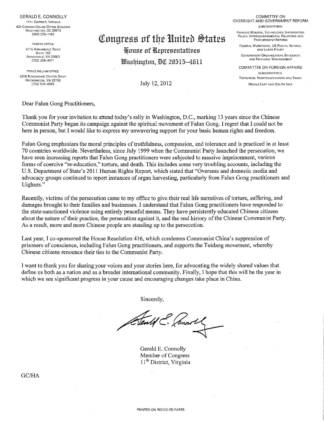 代表美国维吉尼亚州第十一选区的联邦众议员杰拉尔德•康诺利(Gerald E. Connolly)致函法轮功学员,表达他对法轮功学员基本人权和自由权利的坚定支持。