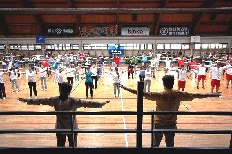 结果第二天,我们先被当地电视台邀请接受了采访,之后在一所高中,教授了两堂课的功法。第一堂课来了三十多名学生。当法轮功这个词传播出后,第二堂课有近一百五十名学生来学功。学生们到来后看起来很难维持秩序,但大法音乐刚一播出,学生们马上各就各位,安静下来。