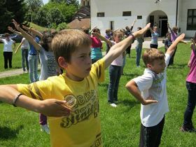 教完功后,中国学员用中文教孩子们念“真、善、忍” 和“法轮大法好”。当近百名孩子齐诵“法轮大法好”时,响亮清纯的童声响彻整个体育大厅,震撼人心,我们为能助师正法感到骄傲自豪。
