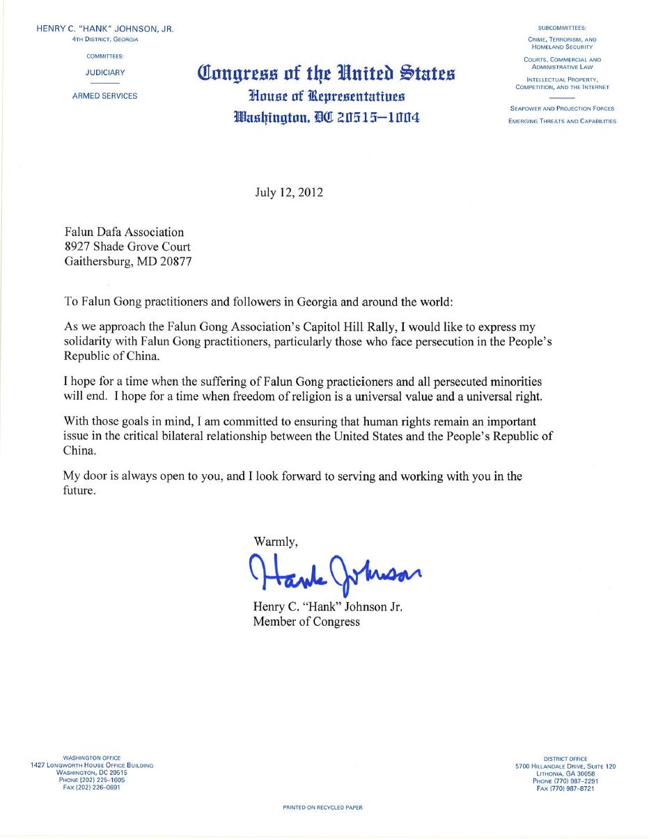![]() 美国乔治亚州第四选区的联邦众议员小亨利(汉克)•约翰逊给法轮功学员的支持信 |