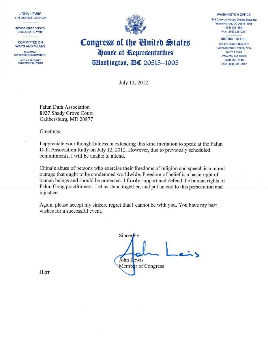 美国乔治亚州国会议员约翰•路易斯(John Lewis)向法轮功学员致函。他在信函中说,中共迫害法轮功应该受到全球的谴责,他将和法轮功学员站在一起,结束这场迫害。