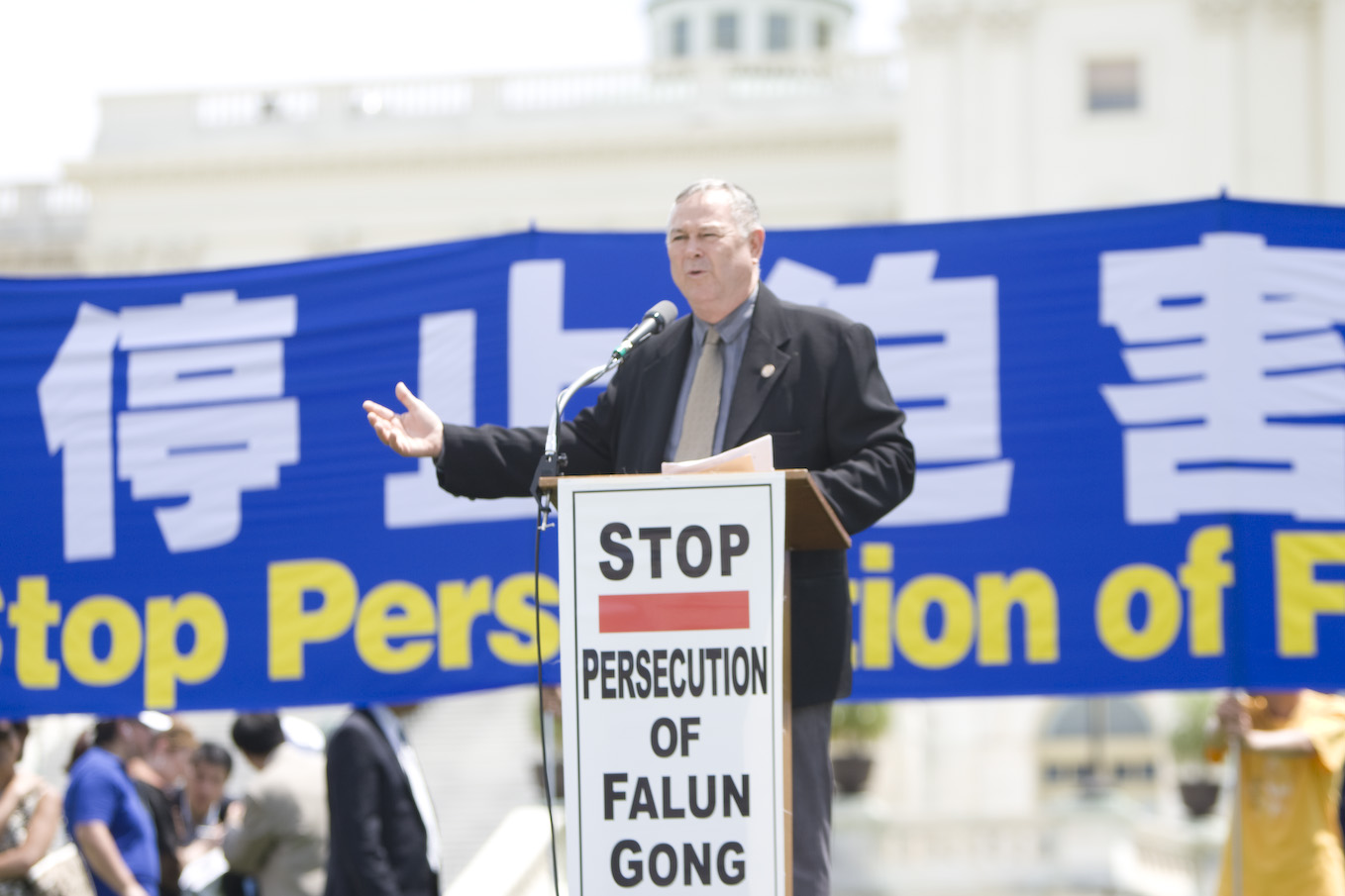 美国加州国会民主党众议员山姆•法尔(Sam Farr)在集会上发言,他说,“我站在这里,对今天在此分享你们真善忍指导原则的数以千百计勇敢的人们怀着肃然起敬的心情。”