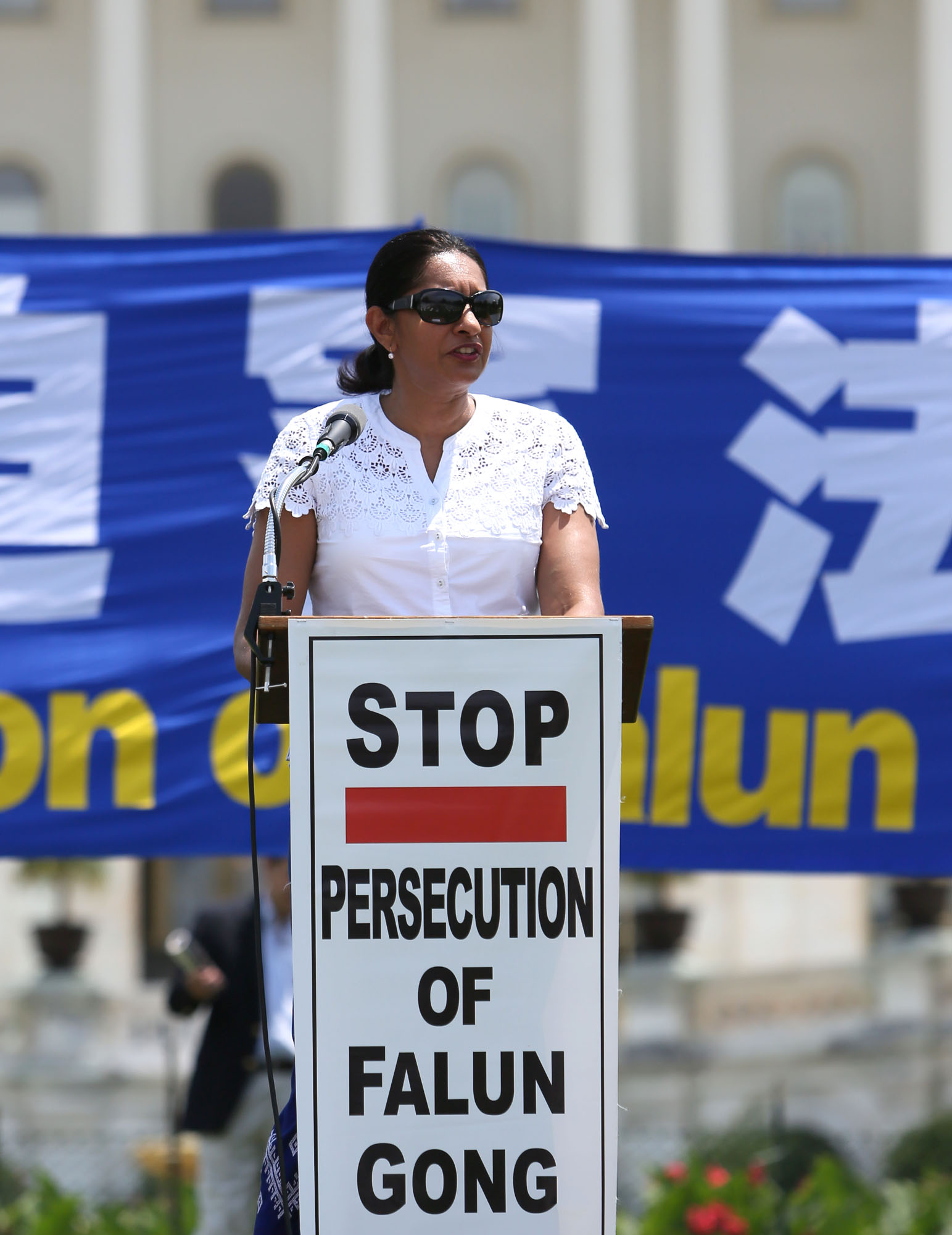 “自由之家”(Freedom house)国际宗教自由和东南亚项目主任苏•刚纳沃德纳-沃恩博士(Dr. Sue Gunawardena-Vaughn)在集会上表示:“我们这些拥有自由的人们,拥有道义的责任,为那些没有自由、无法发出自己的声音的人们,那些被遗忘、在黑暗监狱里被折磨的人们呐喊。今天,自由之家坚定地和法轮功学员们站在一起,和全世界勇敢地为能和平实践两个最基本的自由,世界公认的人权——表达自由和信仰自由而努力的兄弟姐妹们在一起。 ”